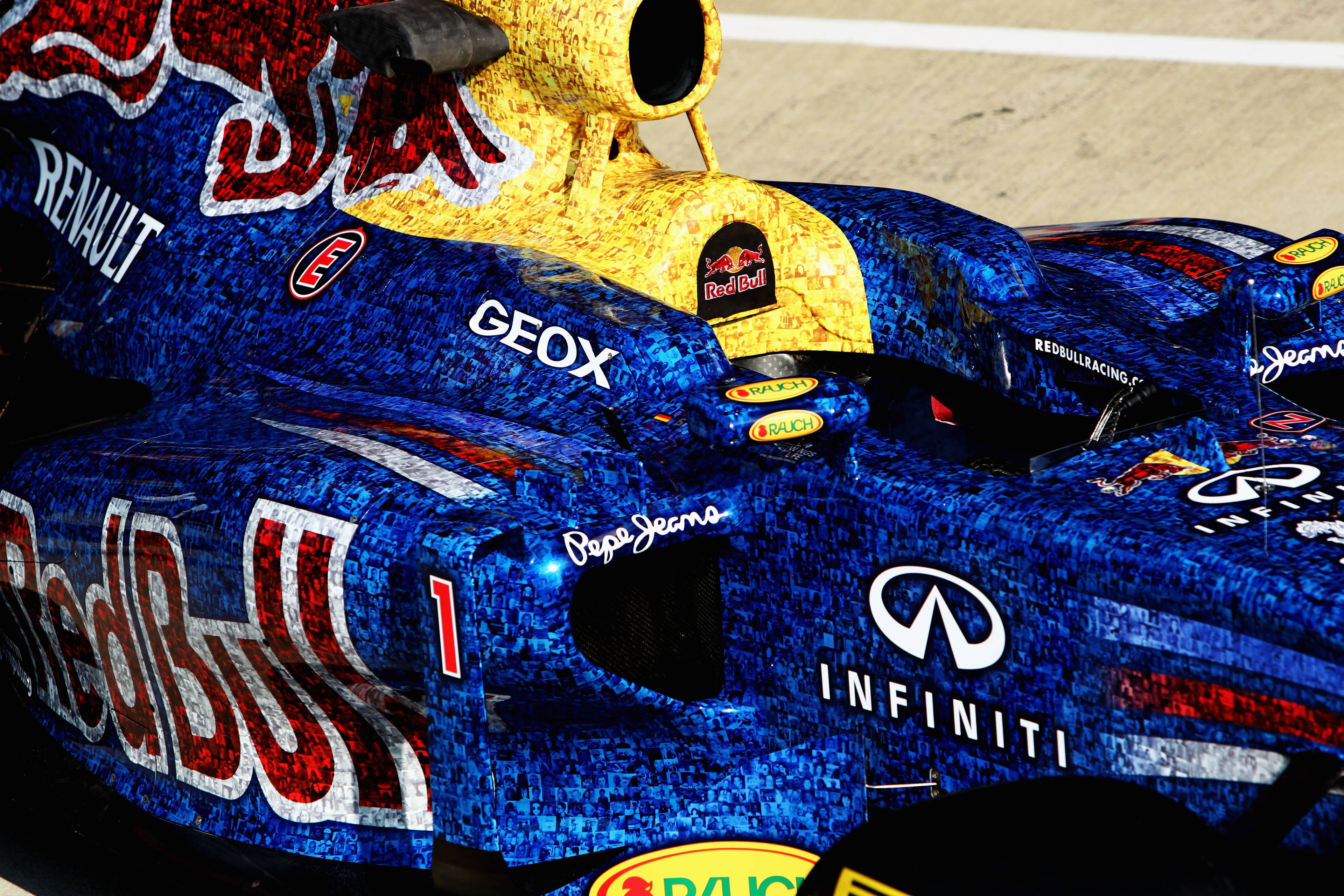 La decoración "Faces for Charity" del Red Bull RB8 de 2012 fue un diseño especial utilizado en el Gran Premio de Gran Bretaña como parte de la iniciativa Wings for Life. La carrocería del coche se cubrió con un mosaico de miles de pequeñas fotos enviadas por los aficionados para simbolizar el apoyo mundial a la investigación de la médula espinal. Esta creativa y significativa decoración no sólo honró a los fans de Red Bull, sino que también ayudó a recaudar importantes fondos para la fundación. Fue una impactante representación visual de unidad.