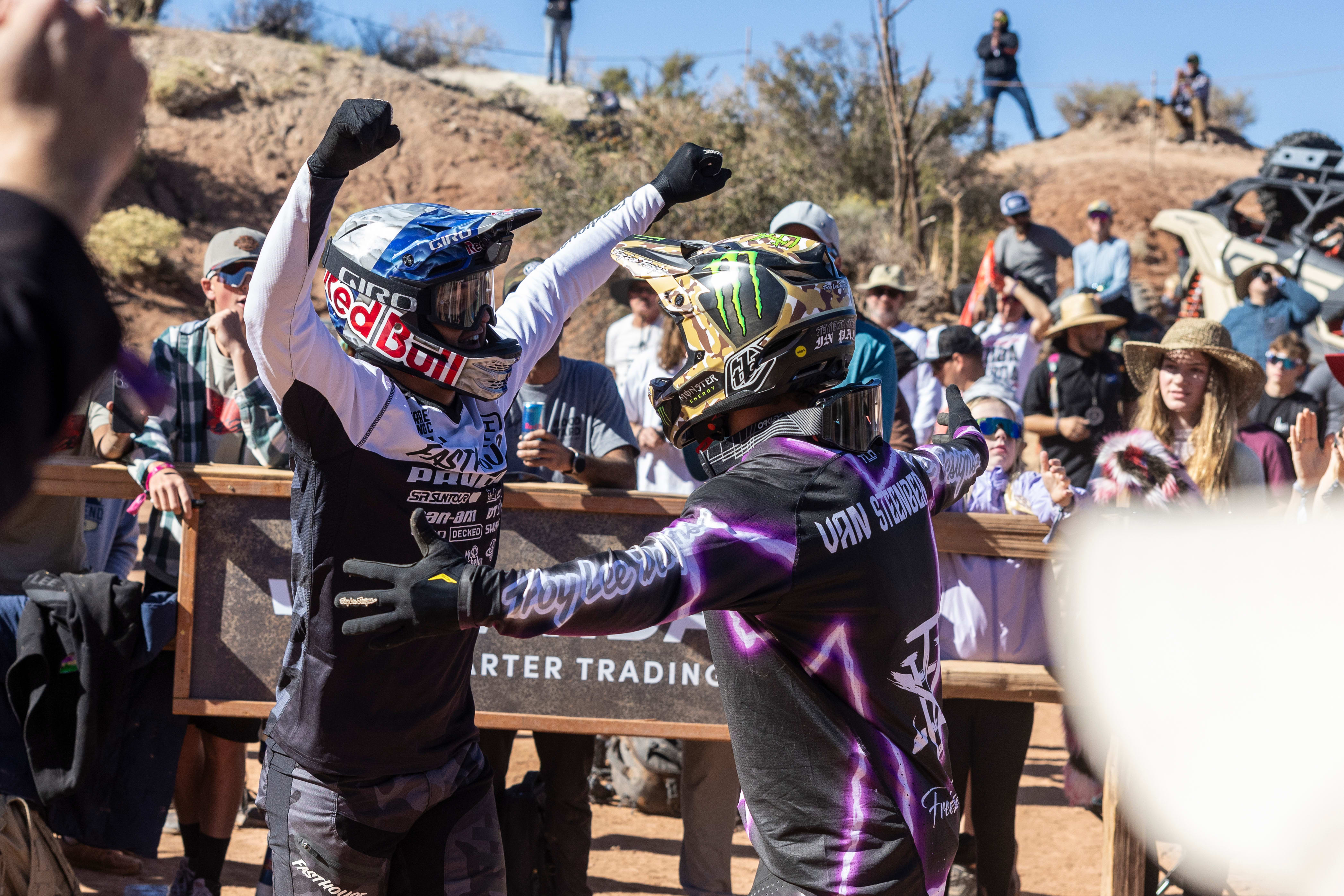 Carson Storch y Tom Van Steenbergen celebran en Red Bull Rampage 2023