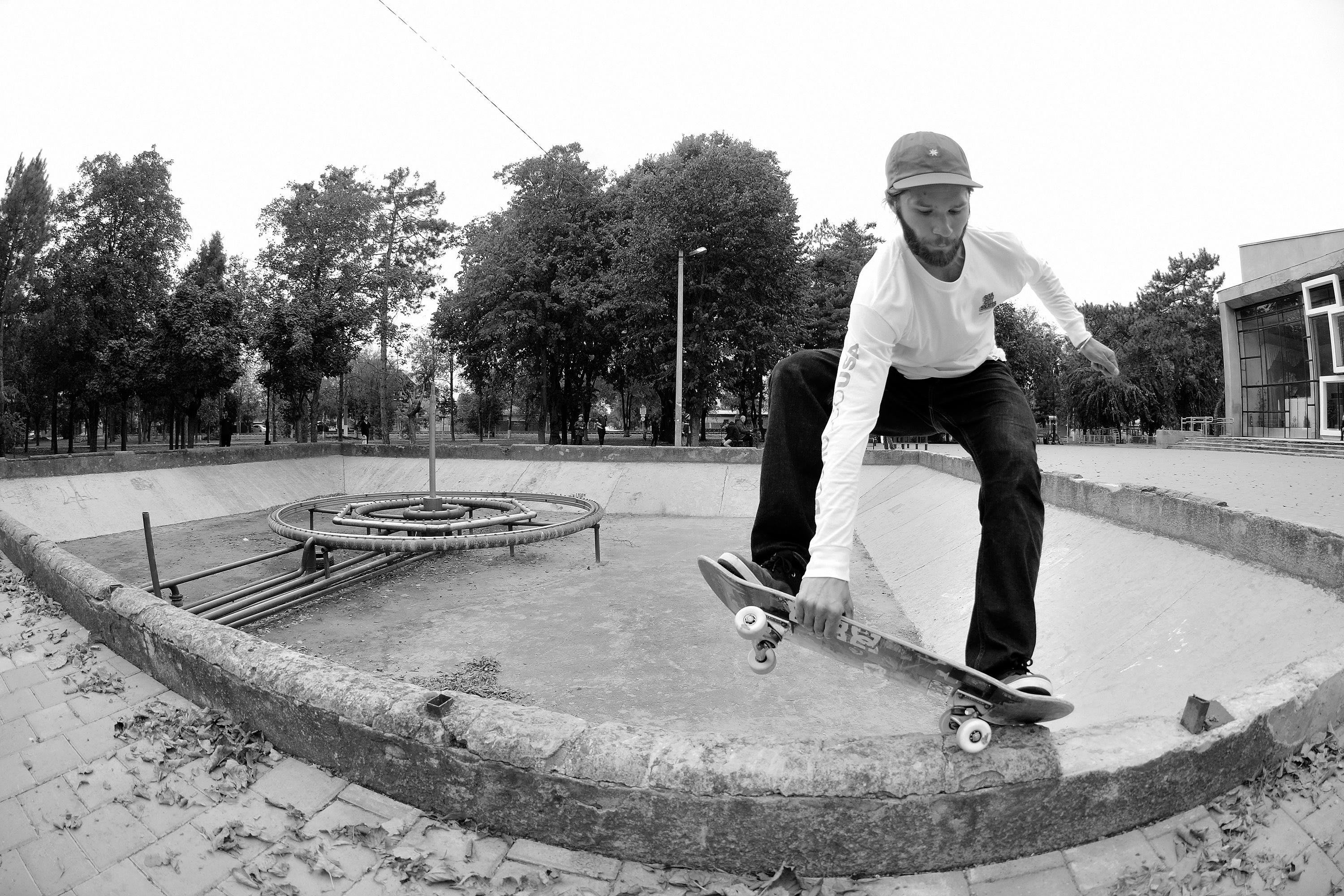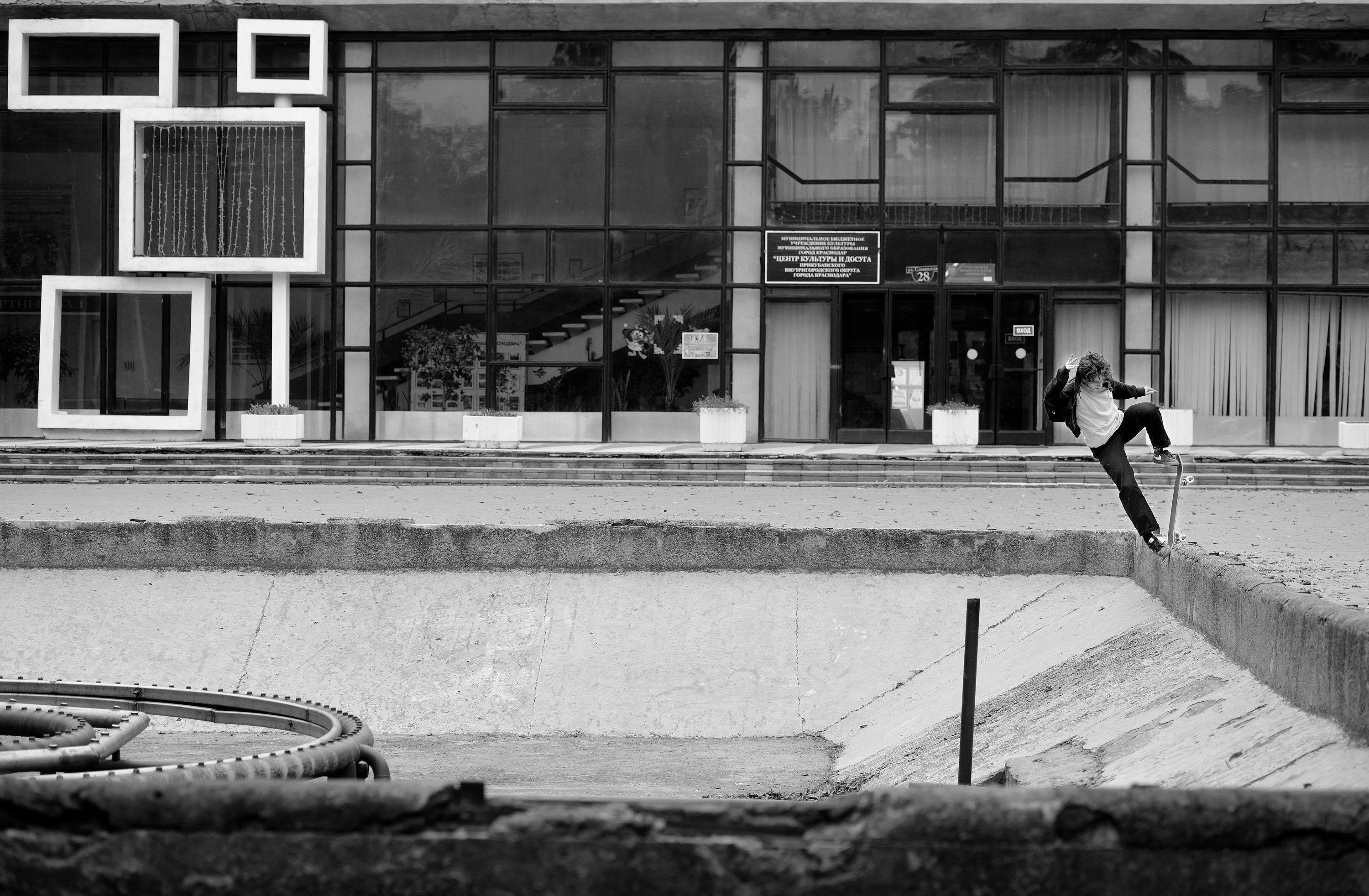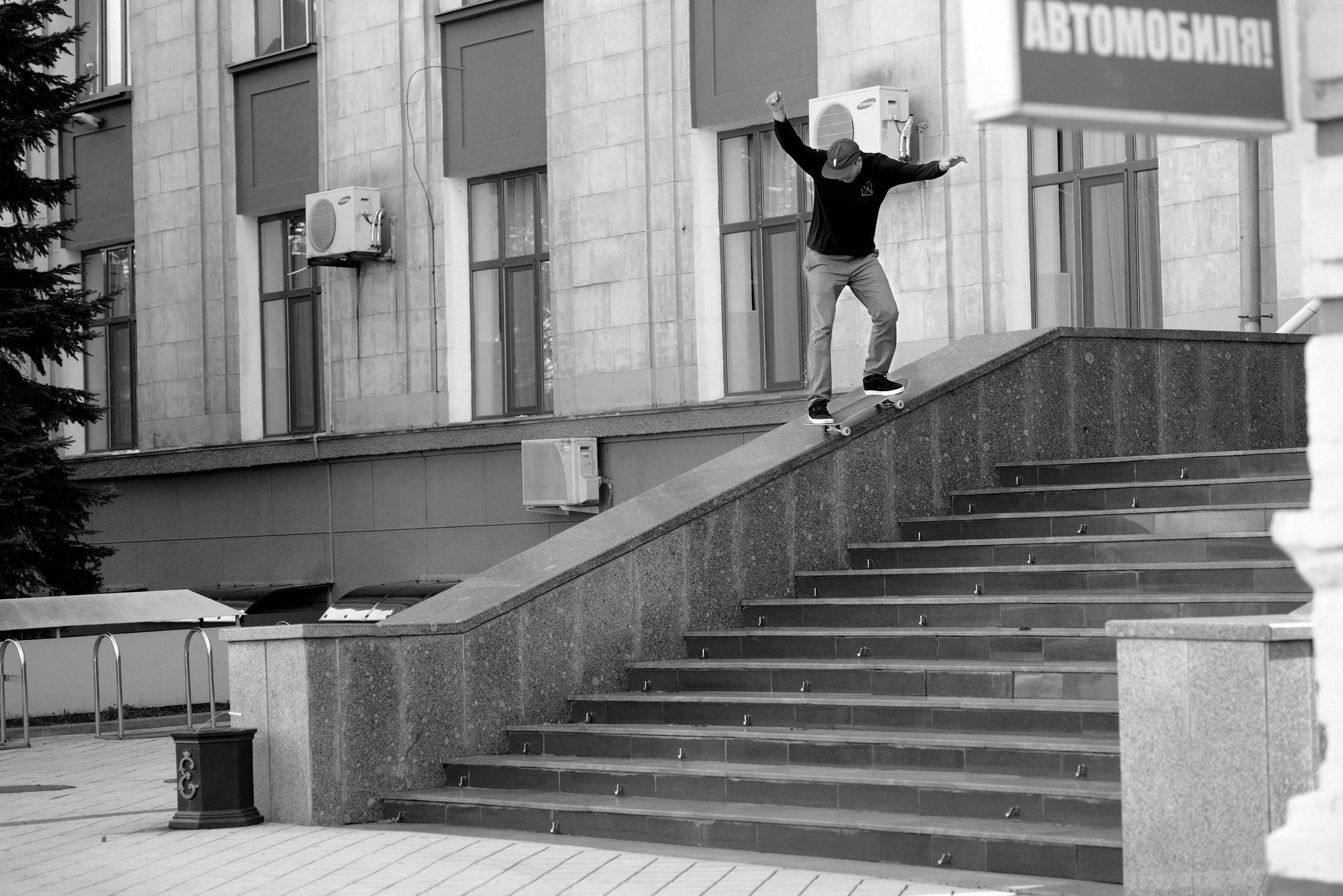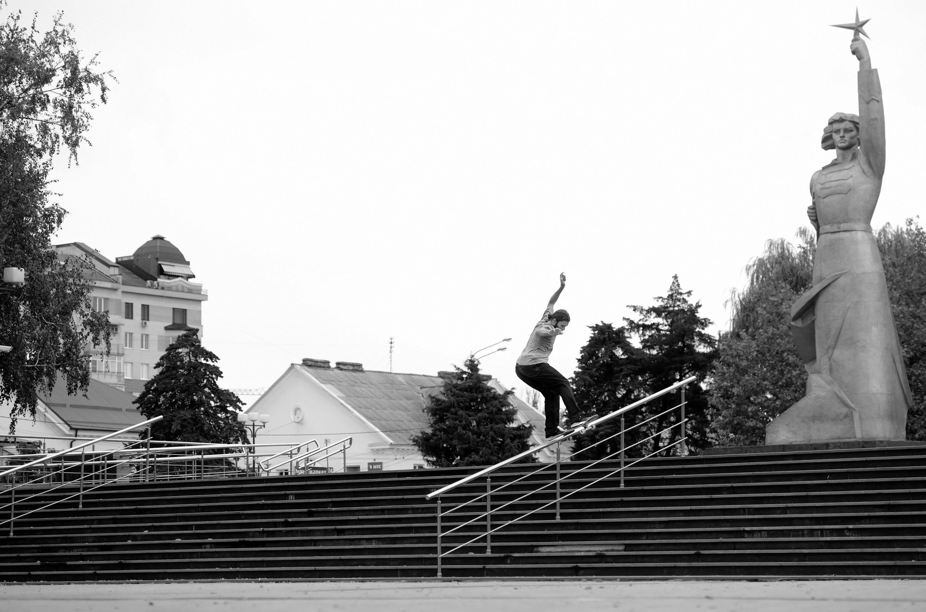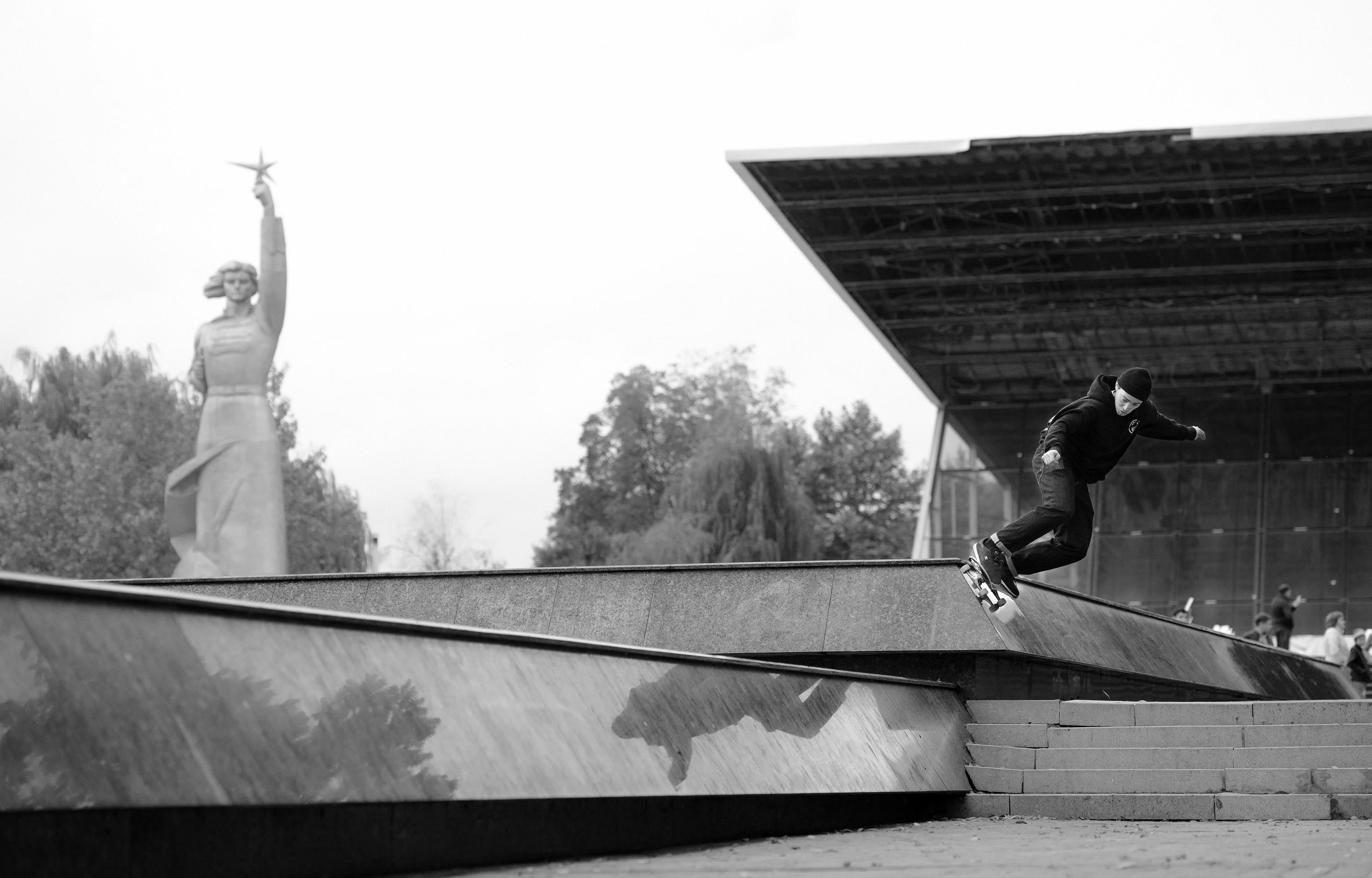 La segunda parada del viaje fue la ciudad de Maykop. Ninguno de nosotros había estado allí antes. Se trata de un lugar en el que el skate apenas existe. Maxim Kruglov era el único que conocían. En Maykop encontramos un monumento de un avión con un épico “quarter pipe” en la parte de abajo.