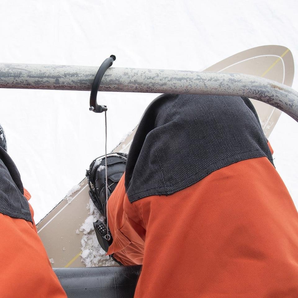 Y si eres del que sufre de dolor de rodillas y te molestan especialmente los remontes con el peso de la tabla colgando de tu pata. Este otro invento te va a encantar, ya que te permite engancharte a la barra del telesilla dándote ese confort extra, y además, te servirá también de candado para cuando te vayas a la cafetería y tengas miedo de que te roben tu tabla nueva.