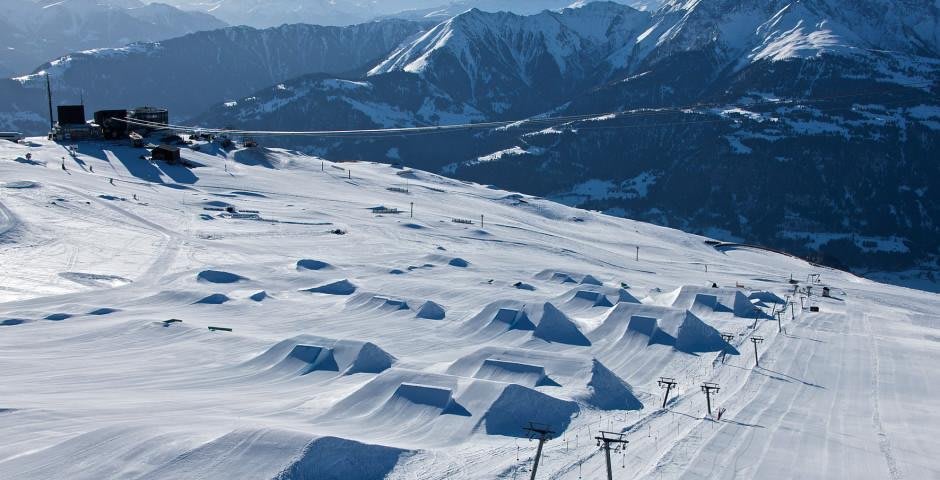 No hace falta que seas pro para disfrutar de los snowparks de Laax. Tienen un snowpark para debutantes, otro para riders de nivel intermedio, el pro y la zona de halfpipes.