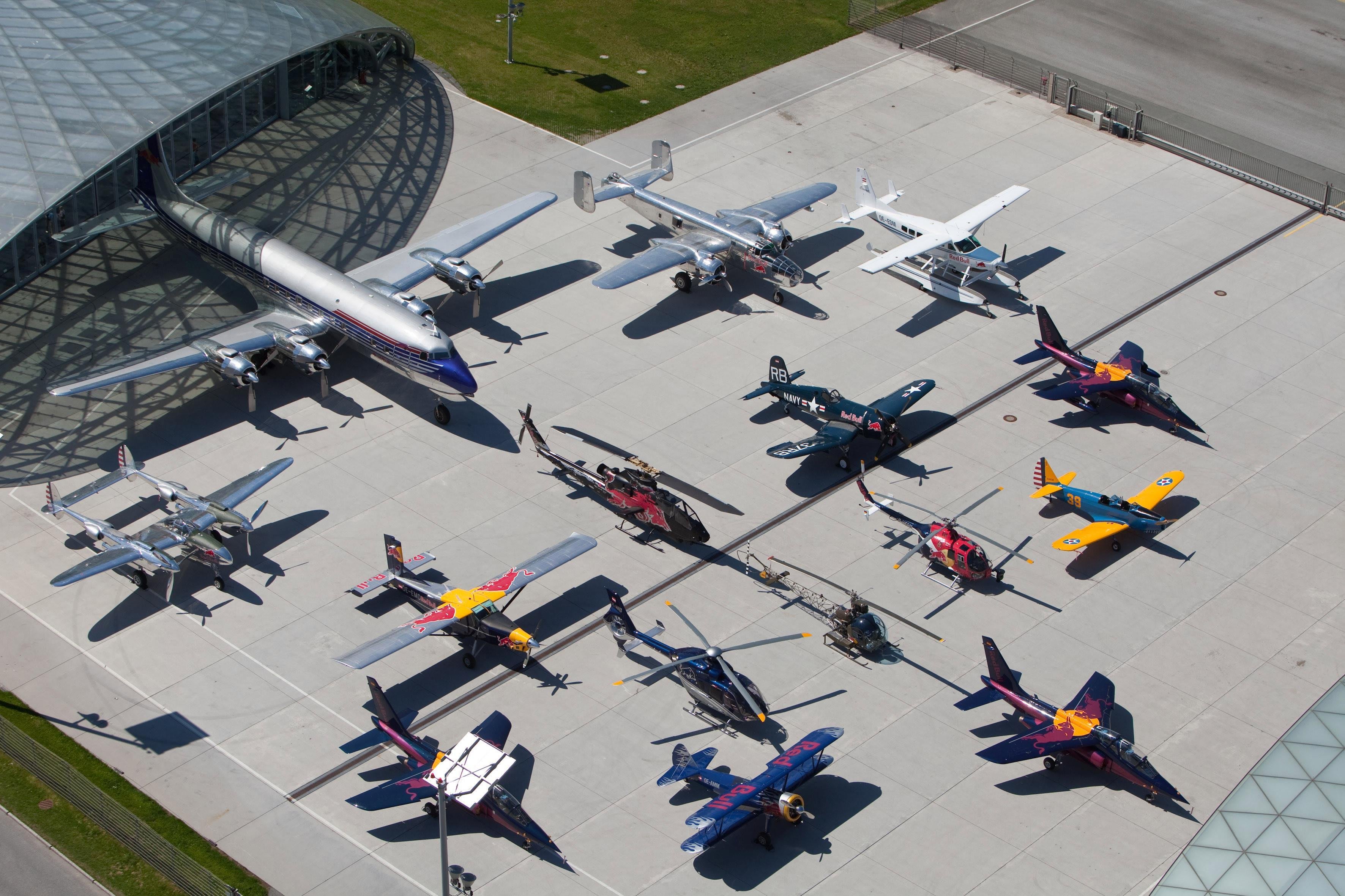 La colección, única y admirada en todo el mundo, incluye rarezas como el Lockheed P-38 Lightning, un North American B-25J Mitchell, un Chance Vought F4U-4 "Corsair" y un Douglas DC-6. La flota de helicópteros no es menos impresionante con dos BO 105, el único helicóptero civil del mundo con licencia para realizar acrobacias aéreas, además de helicópteros como el Bell Cobra, que puede presumir de un pasado glamuroso.