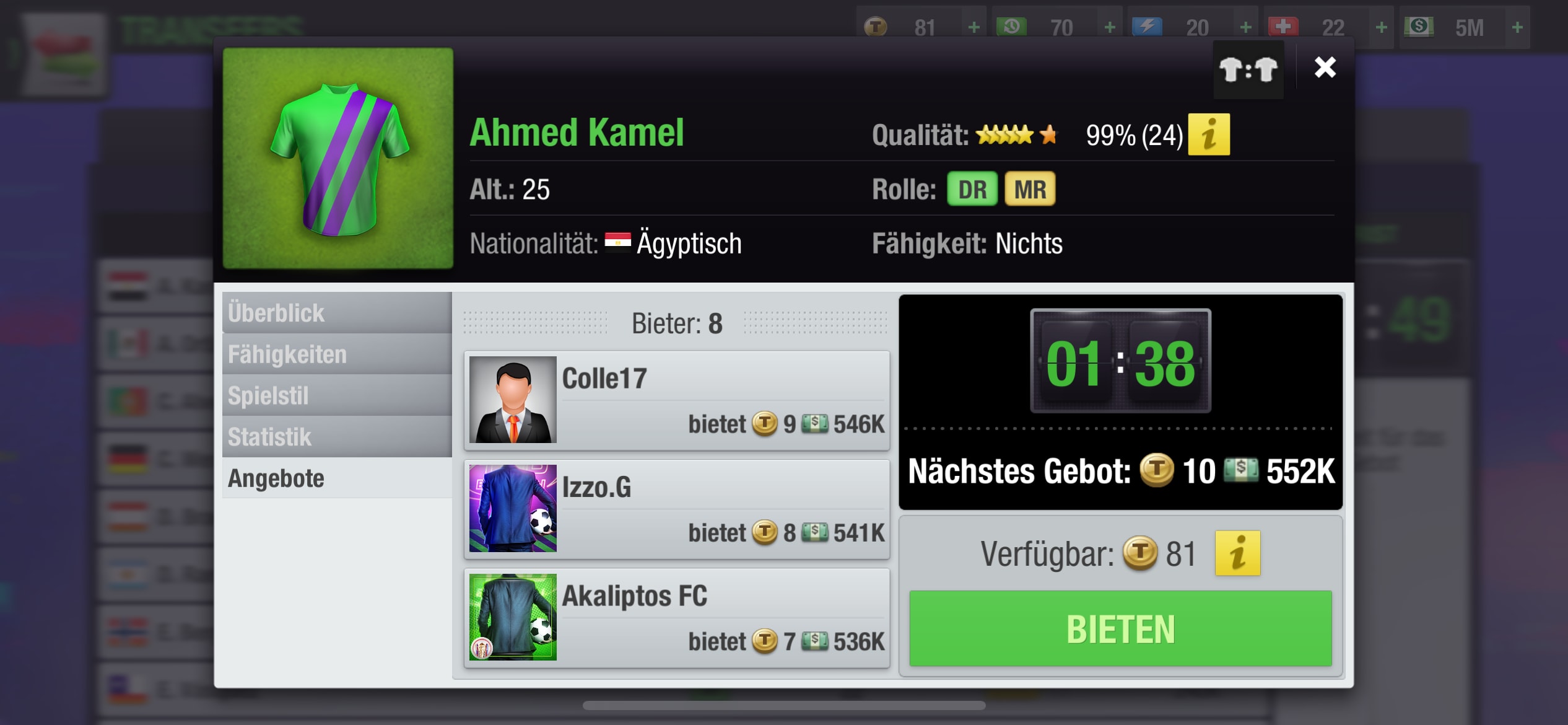 Utiliza tu presupuesto con prudencia y no compres un jugador de primera línea, sino unos cuantos jóvenes talentos. Son más baratos, suelen desarrollarse mejor y hacen progresar a tu equipo a largo plazo. Solo haz tus ofertas de traspaso poco antes del final y evita pujar con otros jugadores. Eso solo hace subir el precio.