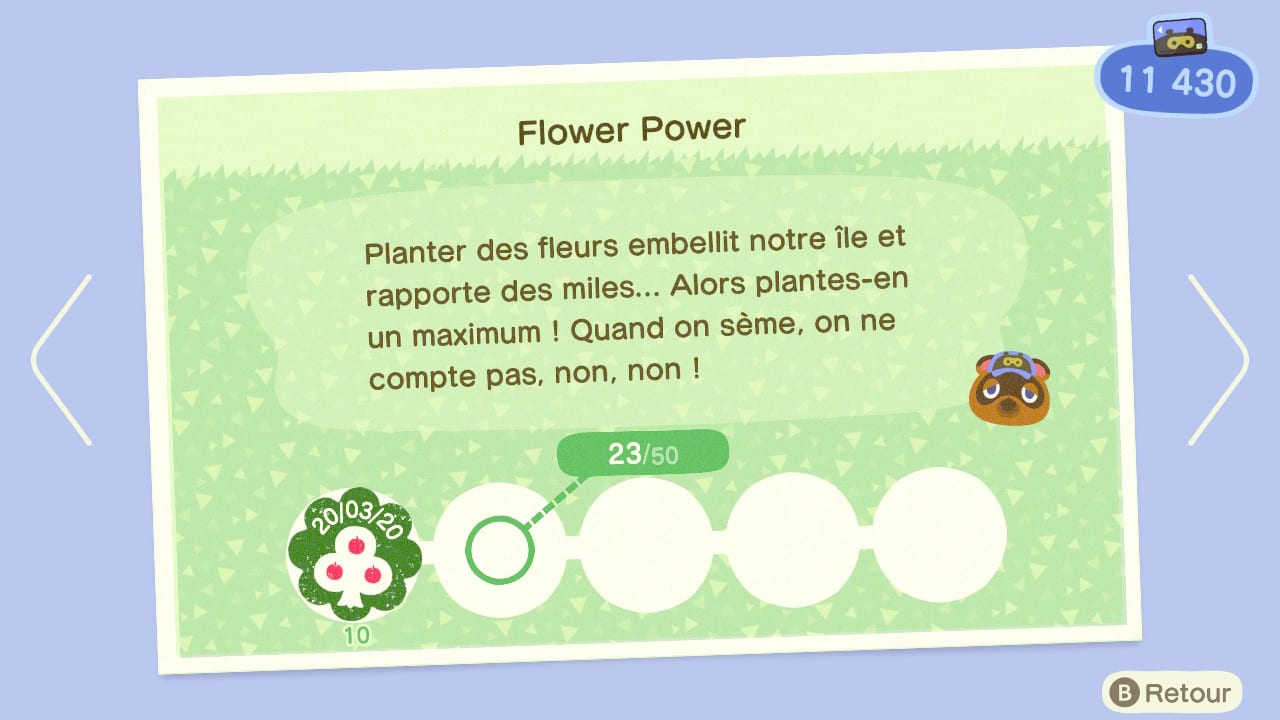 Dans New Horizons, l’économie d’Animal Crossing se retrouve diversifiée. Les clochettes servent toujours de monnaie d’échange principale — c’est avec elles que vous achèterez un grand nombre de biens et services — mais elles sont rejointes par un petit frère, les Miles Nook. Ceux-ci s’obtiennent en réalisant tout un éventail d’actions plus ou moins intéressantes : désherber et revendre la mauvaise herbe, pêcher 5 poissons, faire expertiser plusieurs fossiles au musée, etc. D’autres biens et services, y compris la très utile recette permettant d’augmenter durablement la taille de son inventaire, sont uniquement accessibles en dépensant des Miles.