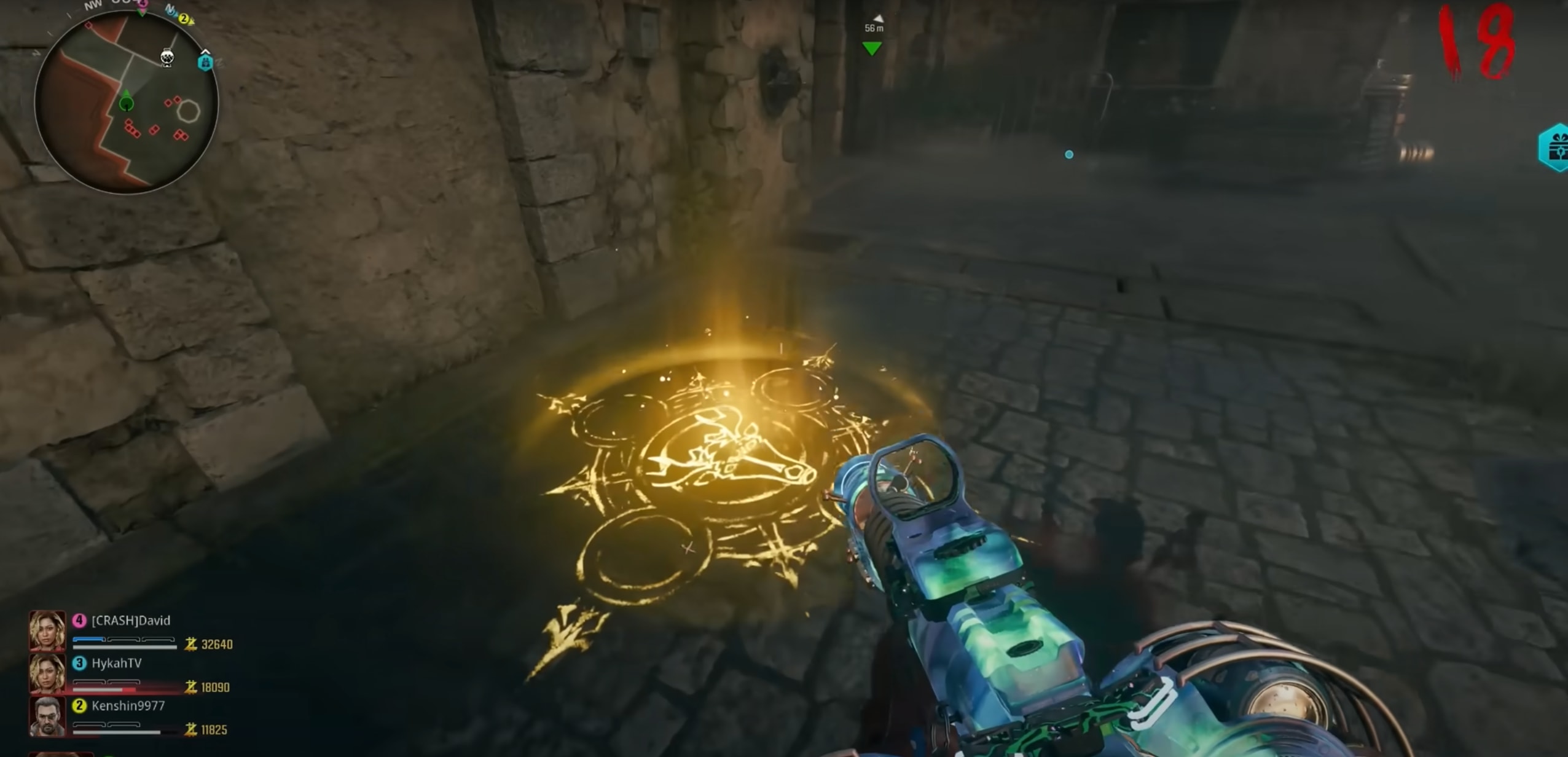 Une fois les bûchers allumés, les zombies viendront en masse. Parmi eux : un Doppleghast. Le tuer vous permettra de récupérer l’Ânkh de Râ, un objet primordial pour la suite de la quête. Une fois en votre possession, allez la poser dans le cercle jaune, dans la cour du château, au-dessus de l’entrée en venant de Speed Cola. Comme tout à l’heure, tuez des zombies, toujours à proximité du cercle, pour faire apparaître le coffre. Cette fois, c’est avec l’épée de feu qu’il faudra mettre un coup de cut.