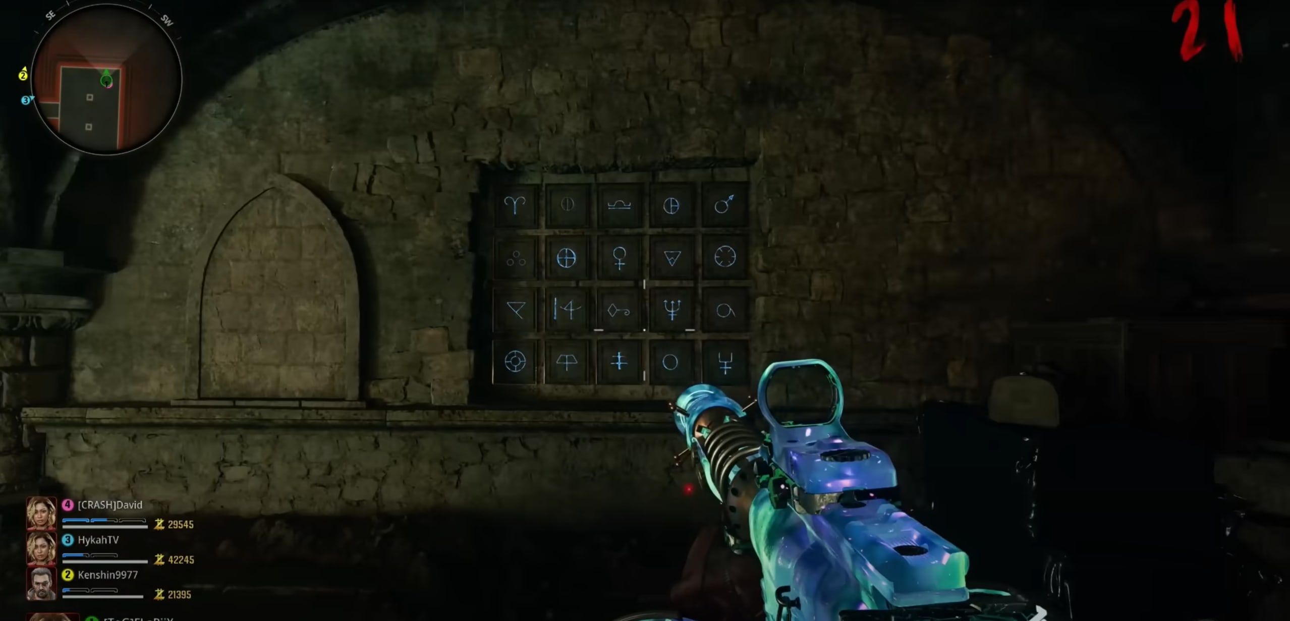 Vous devez désormais trouver le piège correspondant à votre premier symbole. Activez-le, puis, tuez les zombies qui apparaîtront. Si vous réussissez cette étape et que vous retournez au niveau du livre, vous verrez que le premier symbole est désormais éteint, et non plus en rouge vif. Réitérez la manip’ pour les 3 autres symboles.