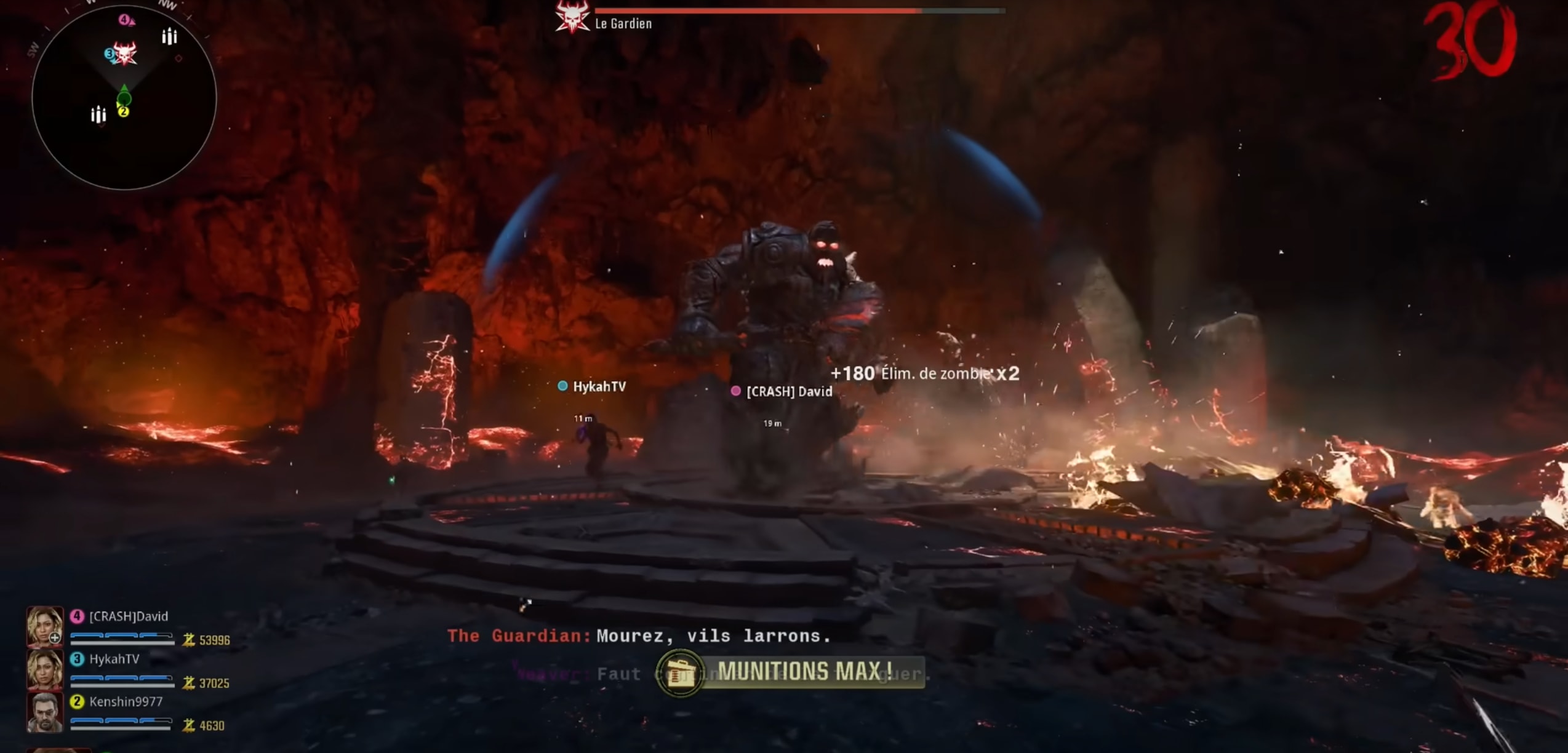 Le combat s’articule en 4 phases durant lesquelles vous lui mettrez des dégâts jusqu’à ce qu’il soit immunisé au centre du décor. Pendant ce temps-là, les zombies apparaissent en grand nombre. A chaque début d’inter-phase, vous verrez la lave couler, et donc réduire la taille de l’arène. Plus vous avancerez dans le processus, plus vous verrez des zombies spéciaux et élites apparaître. N’hésitez pas à vous aider des injections de mutants et des incantations (disponibles autour de l'arène).