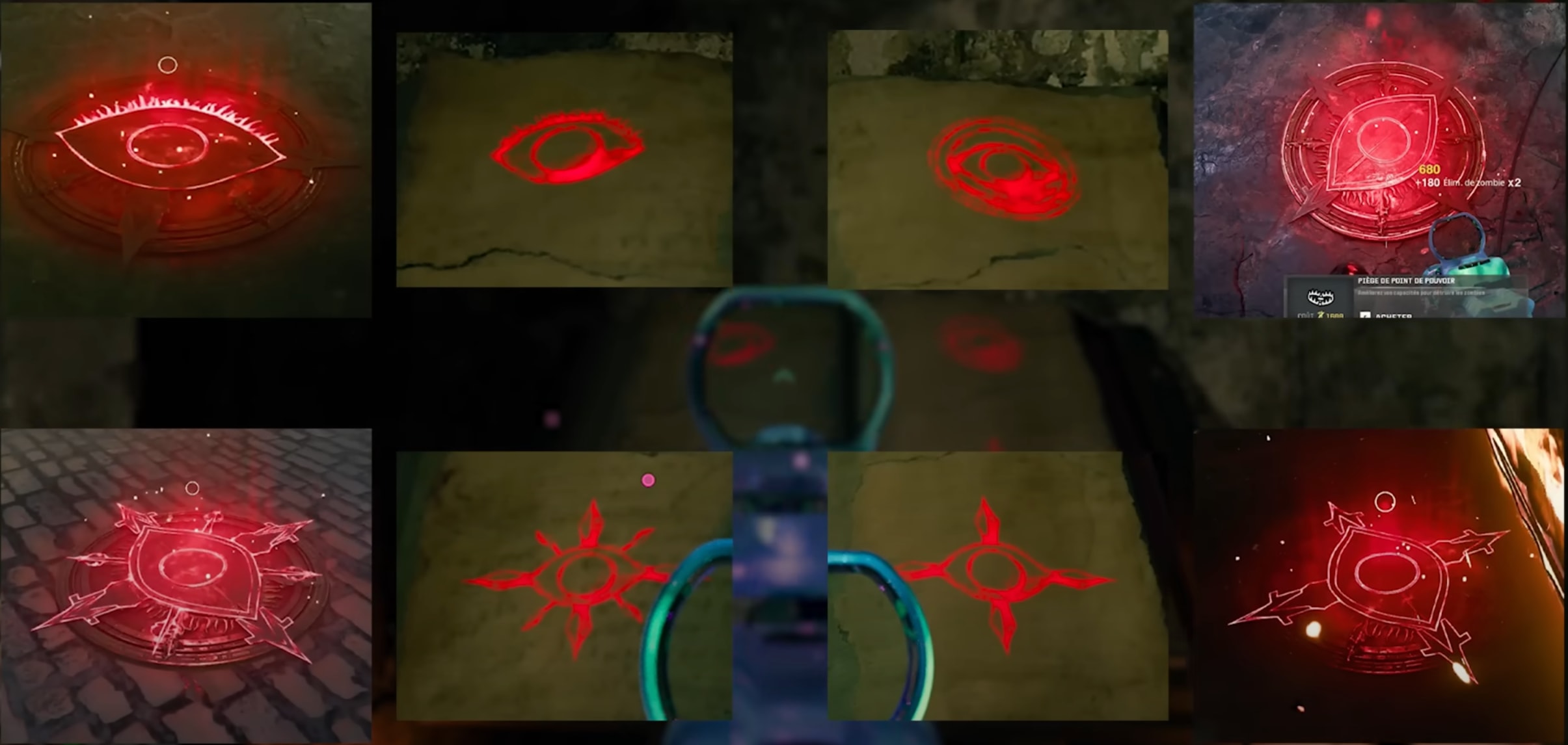 4 symboles s’affichent. Retenez-les dans cet ordre : d’abord celui en haut à gauche, puis en bas à gauche, en haut à droite et enfin en bas à droite. Ces symboles sont également sur les plaques d’égoût (les pièges de point de pouvoir). Il y en a 6 sur la carte qui se trouvent :