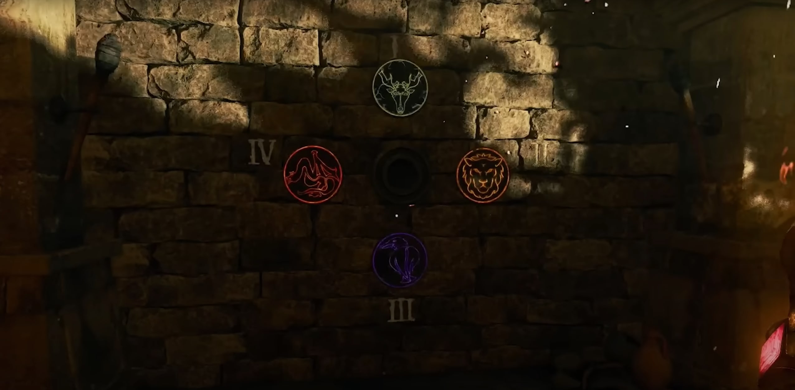 Logiquement, vous devriez voir apparaître les symboles des épées sur le mur des escaliers menant de la crypte au salon. Fiez-vous aux chiffres romains pour noter l’ordre des différents symboles.