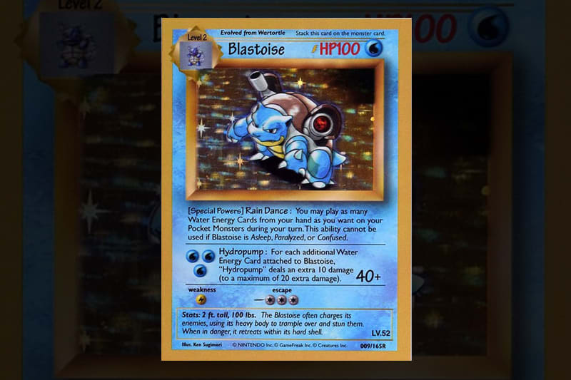 L’une de ces cartes, représentant Tortank, possède une police d’écriture et un design différent de la version finale. Dessiné par Ken Sugimore, il ressemble ici beaucoup plus au Pokémon que l’on pouvait voir sur la boîte du jeu Pokémon : version Bleue. En janvier 2021, cette carte s’est vendue pour 336 000 €. Actuellement, seulement deux cartes de cette version existeraient.