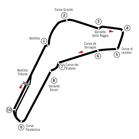 Les 5,793 kilomètres de Monza, ce sont deux chicanes, quatre courbes rapides, un enchaînement à grande vitesse et de longues lignes droites particulièrement favorables aux accélérations. Bref, c'est un vrai régal pour les pilotes et les ingénieurs dont la seule préoccupation est de transformer les monoplaces en fusées capables de pulvériser des records.