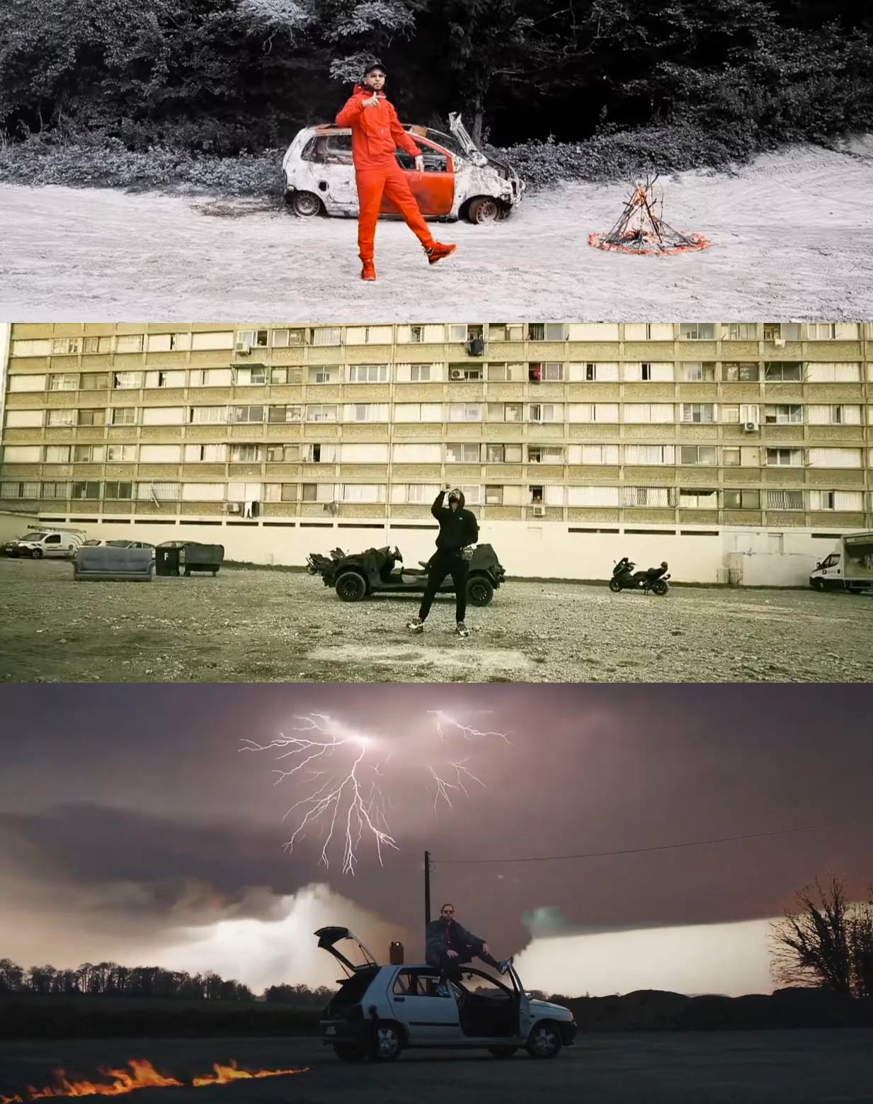 GLK danse devant le cadavre d'une pauvre Twingo, Alonzo fait de même (est-ce une pique enver JuL, fan invétéré du modèle ?), alors qu'Ideal Jim trône au sommet d'une Clio attendant les flammes... Qui sera le rappeur à mettre fin à cette malédiction ?
