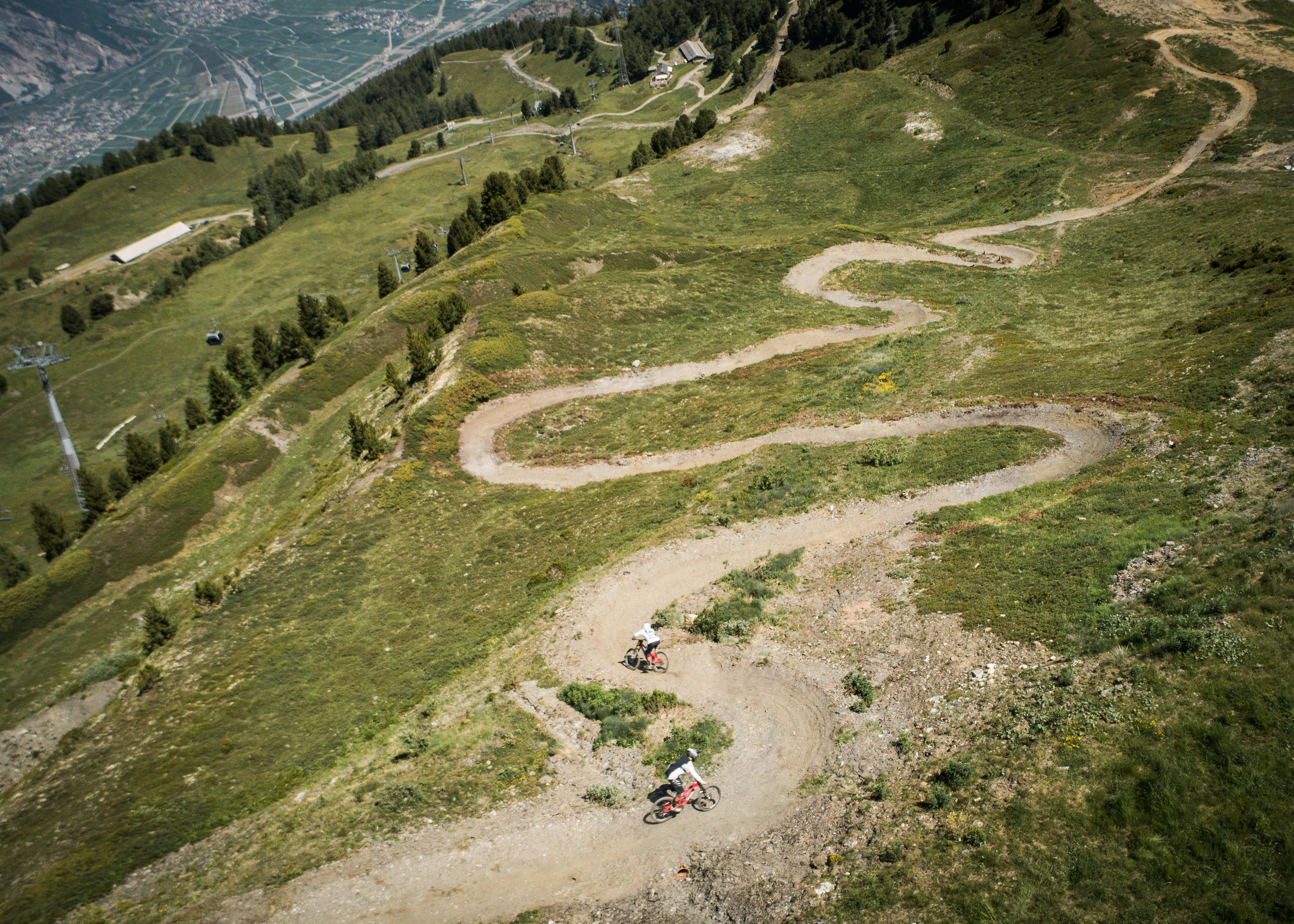"On a mis cinq mois pour créer notre dernier tracé (Atlas) à Métabief" complète Sylvain Authier. "Sachant qu’il y a eu 72 000 passages en 2019 sur notre unique télésiège, les pistes doivent forcément être entretenues pendant toute la saison pour ne pas trop se détériorer. On a une équipe de cinq bike patrols dont deux au minimum qui sont sur le bike park au quotidien pour prendre soin des descentes." À Verbier où le dénivelé est plus important, l’équipe de la station est particulièrement vigilante quand la pluie est annoncée. "On contrôle les rigoles et les tuyaux pour être sûr que ça ne va pas se boucher et faire trop de dégâts. Tous les vendredis, on fait une descente de chaque piste et on l’affine au râteau. Une DH de Coupe du Monde va se détériorer plus facilement. Sur un flow trail, il y a moins de travail car la terre est meilleure et les riders freinent moins fort car c’est moins pentu. Mais la piste bleue (photo ci-dessous), c’est tout de même 500 heures de travail par an."