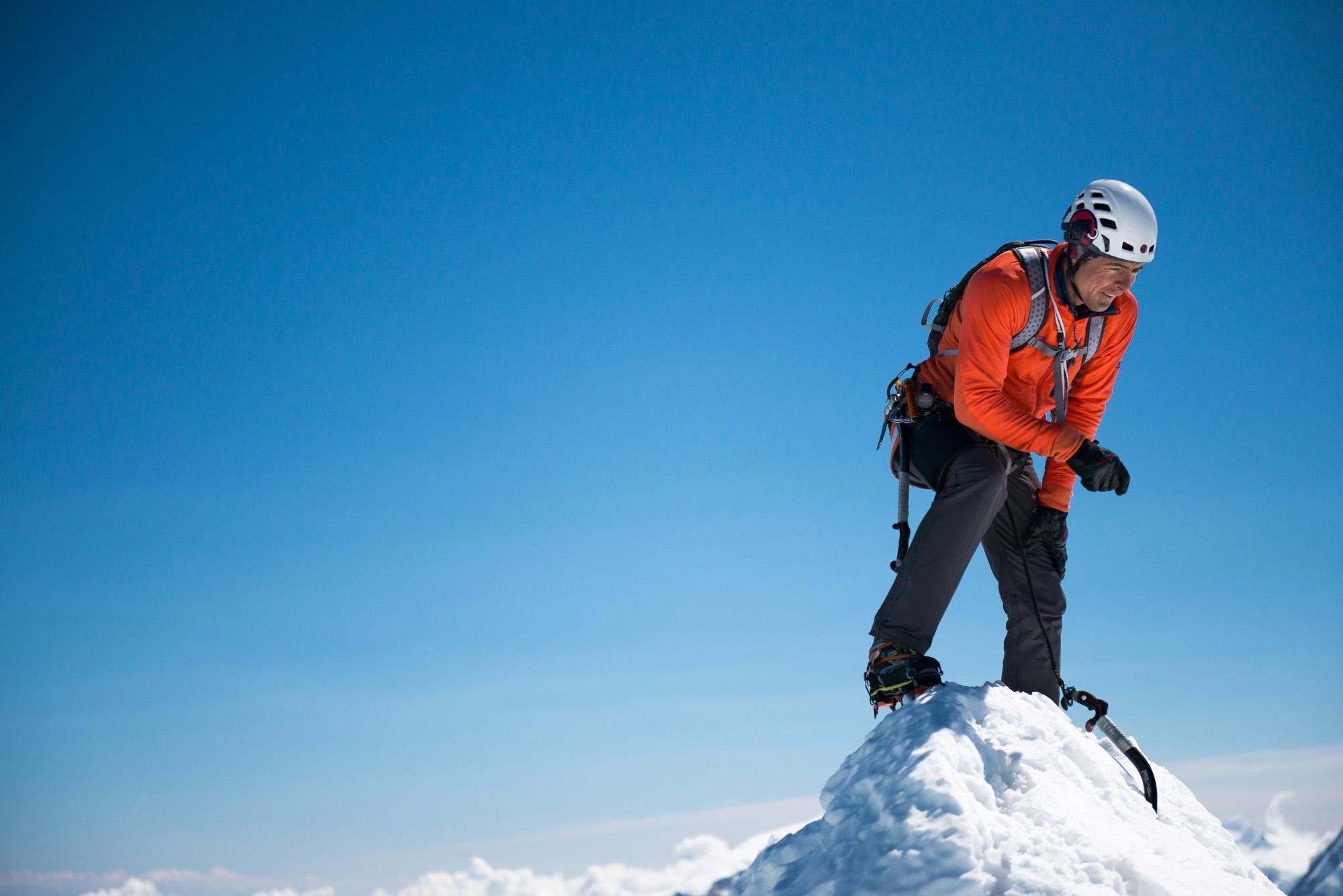 Mais, équipé de piolets et de crampons pour lui donner de l'adhérence, Arnold s'est déplacé avec vitesse et confiance, traçant sa voie vers le sommet, où l'épuisement se lisait aisément sur son visage. Après avoir repris son souffle, l'alpiniste a contemplé ce qu'il venait de réaliser.