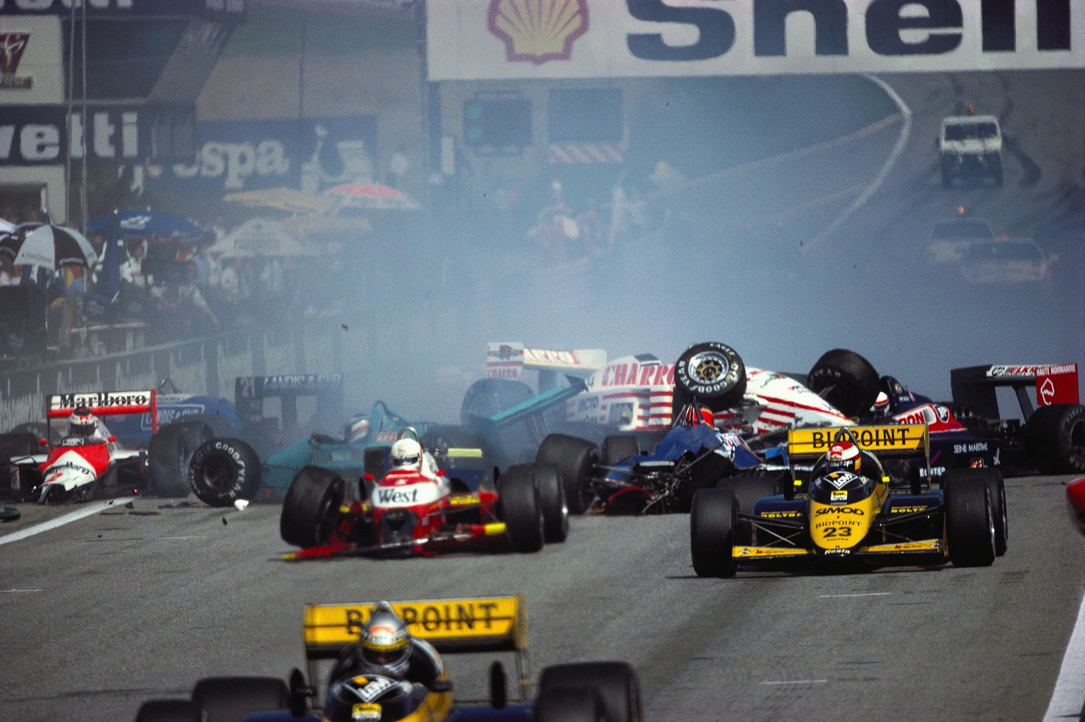 Plus de dix voitures sont endommagées dans les deux collisions. Et Mansell l'emporte sur sa Williams.
