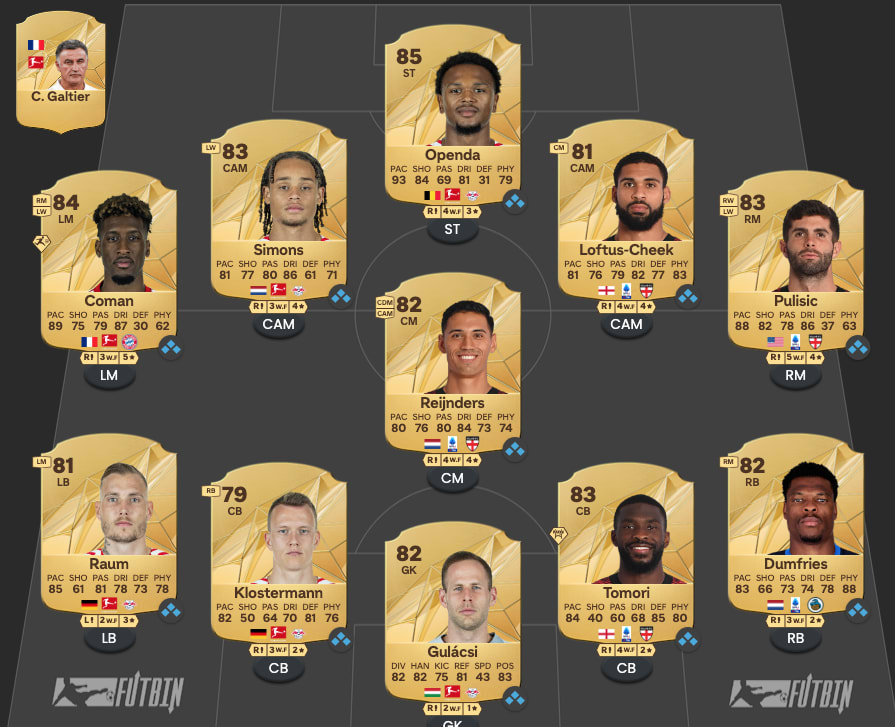 Si le milieu et la défense sont de qualité, le point fort de cette formation reste sans aucun doute l’attaque. Sur les ailes, ça risque de briser les reins adverses. Kingsley Coman est une valeur sûre dans ce registre. Le bavarois possède 89 de vitesse, 87 de dribble et surtout 5 étoiles de Gestes Techniques qui sont devenues presque incontournables au fil des années. Attention, pour qu’il ait tout le collectif, il vous faudra mettre un entraîneur français ! À gauche, on est parti sur Christian Pulisic. Le Milanais bénéficie d’un très beau +3 après sa saison réussie en Lombardie, et risque désormais de poser de gros problèmes. L’aspect le plus intéressant de cette carte est clairement ses étoiles. 4 en gestes techniques et surtout 5 en mauvais pied ! Vous pourrez allumer de n’importe où avec l’américain virevoltant. Pour finir, on a encore décidé d’investir massivement sur le numéro 9. S’il y a bien un poste sur lequel il faut mettre le paquet, c’est celui-ci. Vous l’aurez deviné au vu des autres joueurs présents dans cette équipe, c’est Loïs Openda qui occupera la pointe de l’attaque. Sortant d’une saison à 28 buts en 44 matchs sous le maillot de Leipzig, il dispose désormais d’une carte exceptionnelle. 87 de finition, 85 d’équilibre mais surtout 93 de vitesse. Avec Openda, vous tenez votre serial buteur pour un bon bout de temps.