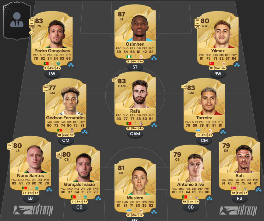 Pour les ailiers, deux mots d’ordre : vitesse et percussion. Comme chaque année, Rafa fera des miracles en début de jeu avec son 93 de rapidité. Son pendant à droite n’est autre que Barış Alper Yilmaz. Là aussi, on est sur une fusée. Par ailleurs, il est également très polyvalent puisqu’il peut jouer ailier droit, gauche et même défenseur latéral. S’il parvient à avoir une ou deux cartes “Team Of The Week”, il deviendra très vite inarrêtable.Enfin un tonnerre d'applaudissements pour la star de votre équipe, j’ai nommé Monsieur Victor Oshimen. C’est probablement le transfert le plus improbable de ce mercato, mais pour votre première équipe UT, croyez-moi, c’est une aubaine ! Jouant désormais pour Galatasaray, son prix est vraiment accessible (10k) et restera stable grâce à son 87 de général. Très physique, rapide, sans être maladroit avec ses pieds, il a tout du buteur providentiel. Par ailleurs, vous pouvez également décider de le remplacer par son homonyme Viktor Gyökeres, le buteur suédois qui affole les compteurs depuis le début de saison. Il est légèrement plus cher, mais devrait être intenable sur le front de l’attaque et rentre parfaitement dans l’équipe au niveau du collectif.