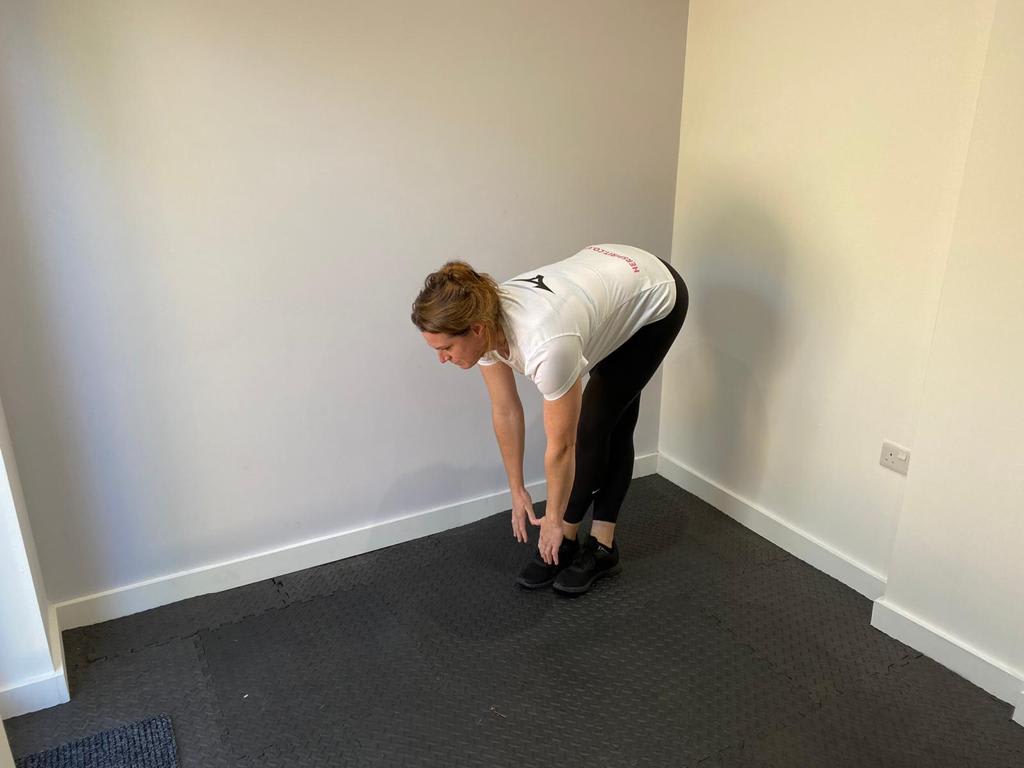 - Soulevez vos bras au-dessus de votre tête et pliez-vous doucement vers le bas comme si vous vouliez toucher vos orteils. Sentez l'étirement dans le dos et sur vos jambes.