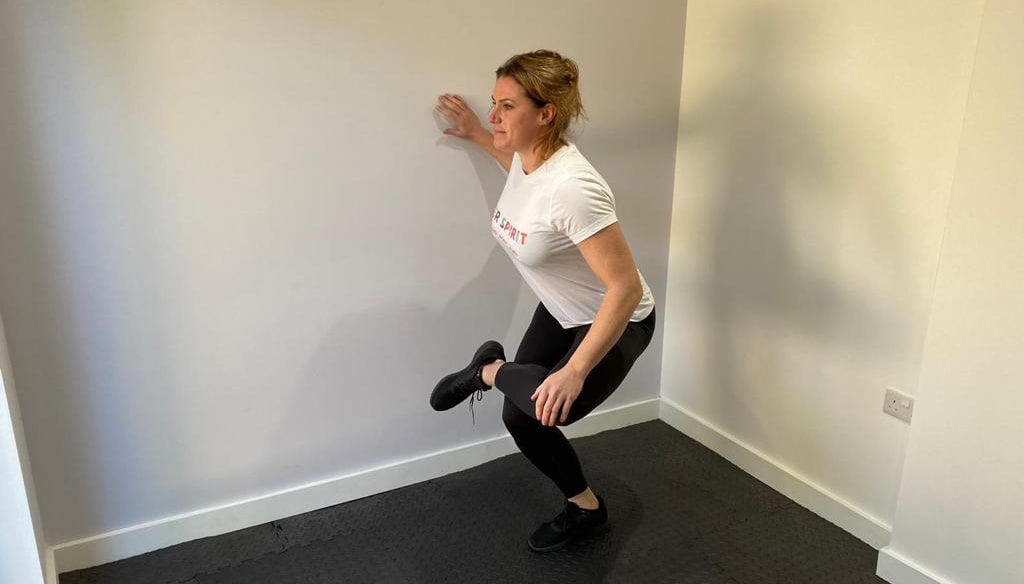 - Pliez ensuite la jambe gauche comme si vous étiez assis sur une chaise (tenez-vous à quelque chose si vous avez besoin de plus de stabilité).