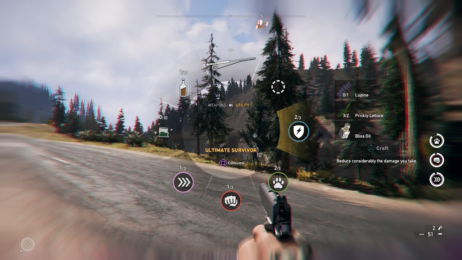 Grâce aux consommables trouvés sur la route, vous pouvez confectionner des objets. Un stimulant pour améliorer temporairement votre vitesse de déplacement, vos dégâts ou votre endurance, ou des objets explosifs. Ça peut vous sauver la vie, donc assurez-vous de bien tout récupérer sur votre passage.