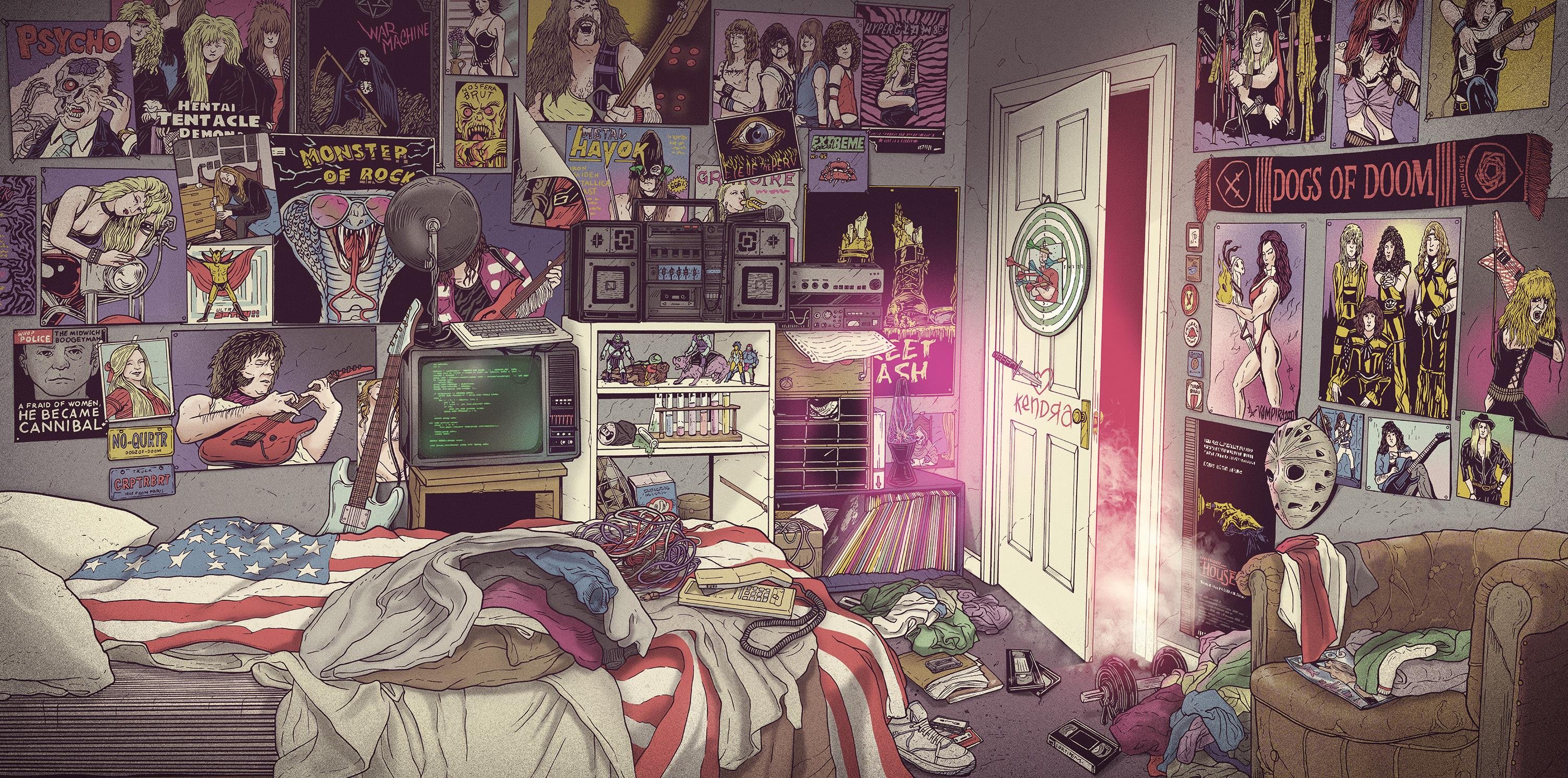 Plus récemment, on a fait la pochette de son album « Leather Teeth », qui est basé sur l’histoire d’un adolescent défiguré en cours de chimie qui devient serial killer. On a notamment fait ce dessin de sa chambre d’adolescent pour l’intérieur de la pochette, qui est bourré de références et de private jokes. Il y a toujours énormément de détails et de références dans ce qu’on fait avec Carpenter Brut. On en propose une partie, lui en propose d’autres et on mélange tout ça. Ça résume assez bien notre démarche : une rencontre, un échange et la volonté de coller à l’esprit de l’artiste et de son projet. »