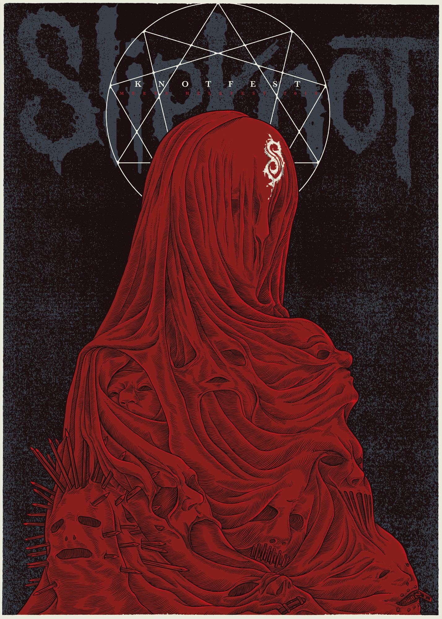 « Chaque année, au moment où tombe la programmation du Hellfest, l'atelier de sérigraphie Le Grand Chic contacte tout son réseau d’illustrateurs et demande à chacun avec quels groupes il a envie de bosser. Ils contactent ensuite les artistes pour savoir lesquels sont partants et une fois qu’il a les réponses, tout le monde se met au boulot. Pour le coup, Slipknot on n’y croyait pas trop... mais le groupe s’est pourtant montré intéressé et a définitivement accepté après avoir vu les croquis.