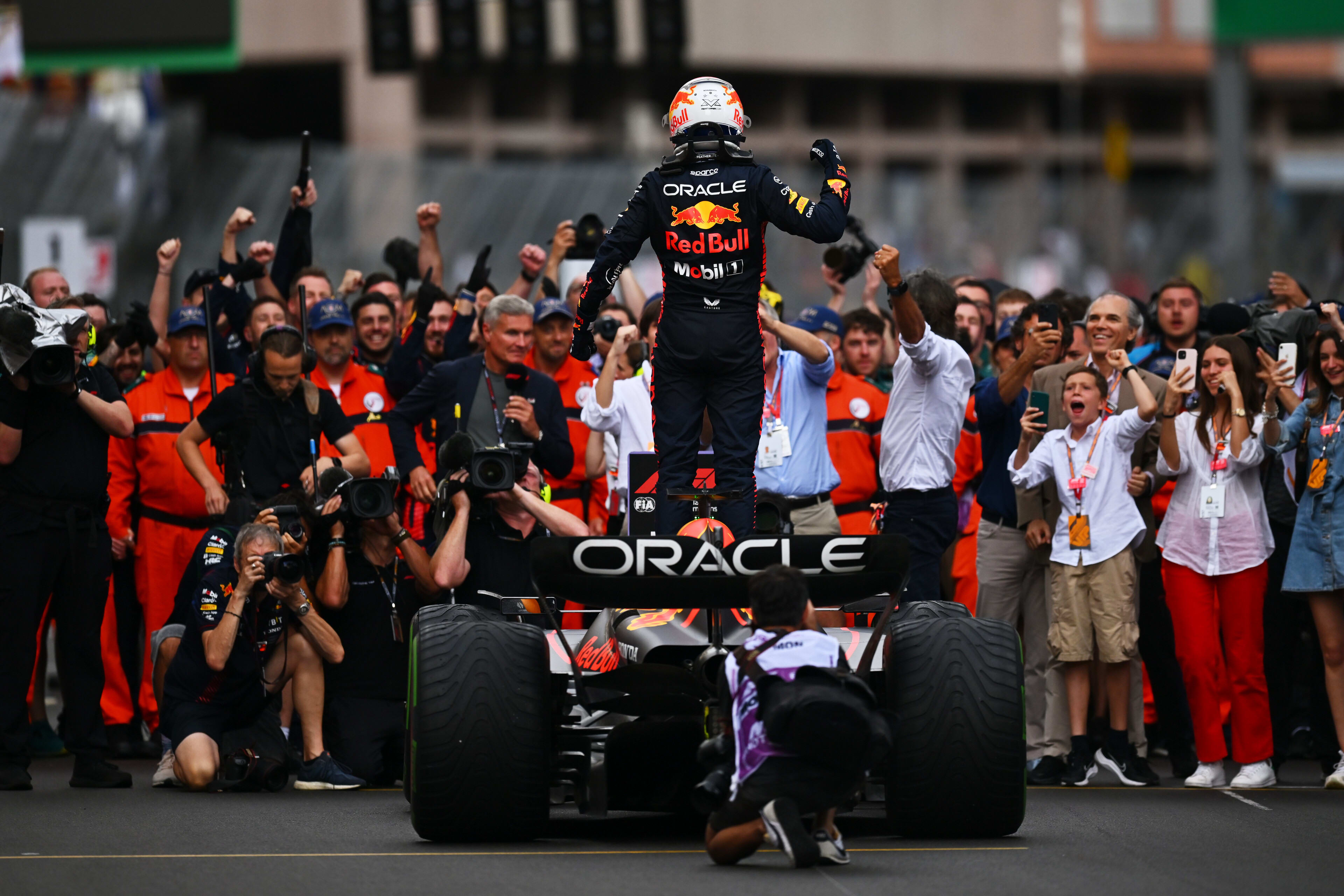 Max célèbre sa victoire avec ses mécaniciens au Grand Prix de F1 de Monaco