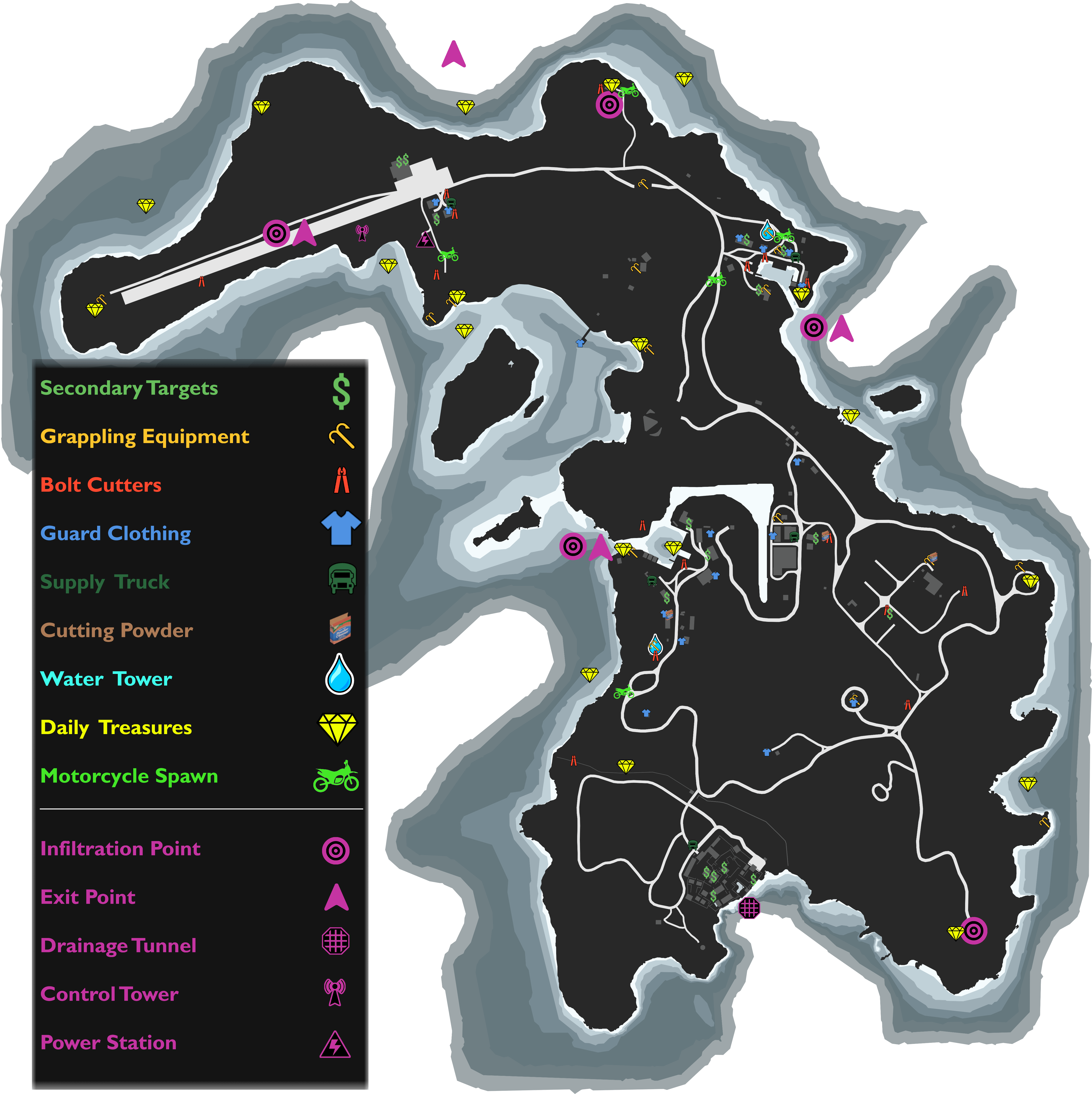 Notez que vous pouvez continuer d’explorer l’île, et que celle-ci regorge de secrets et de points d’entrée. L’utilisateur Reddit ClassiqueGTA a réalisé cette carte bien pratique pour ne rien manquer, qu’il s’agisse des points d’infiltration, d’entrée, de sortie ou même les éléments importants (pinces coupantes, grappins, vêtements de garde), ainsi que les objectifs secondaires. Plus vous récupérerez d’éléments de la sorte, et plus le pactole sera grand ! Si vous n’avez pas eu le temps de tout réaliser sur votre première sortie, ne vous inquiétez pas : il vous est possible de retourner sur l’île plusieurs fois.