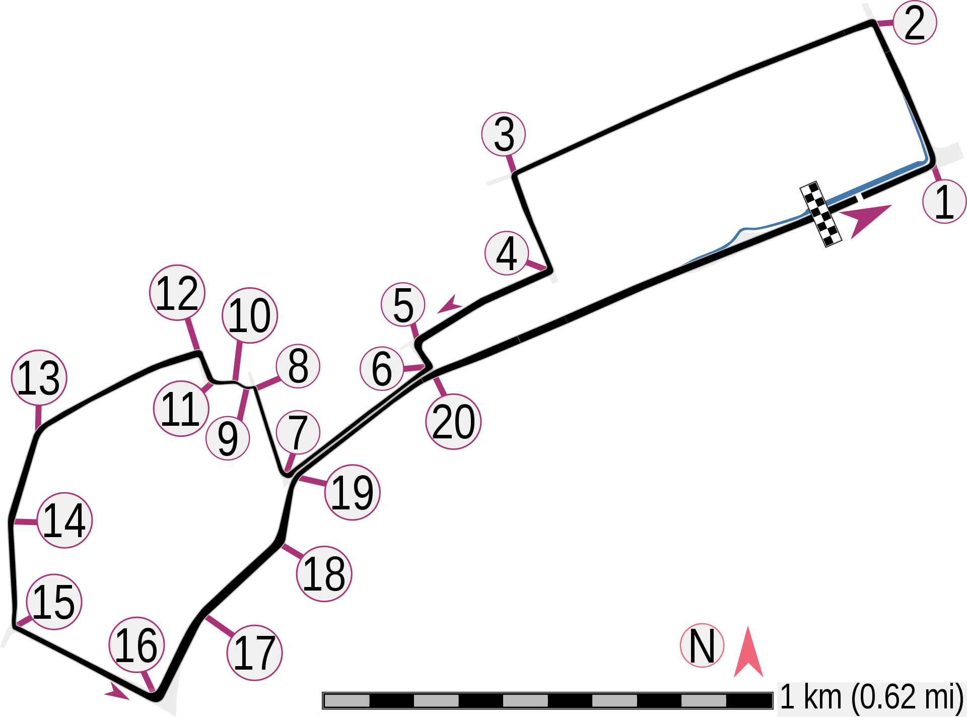 Ajoutons à cela les 20 virages que compte le circuit (dont 4 en angle droit) et l'on obtient l'un des tracés les plus techniques du championnat du monde de Formule 1.