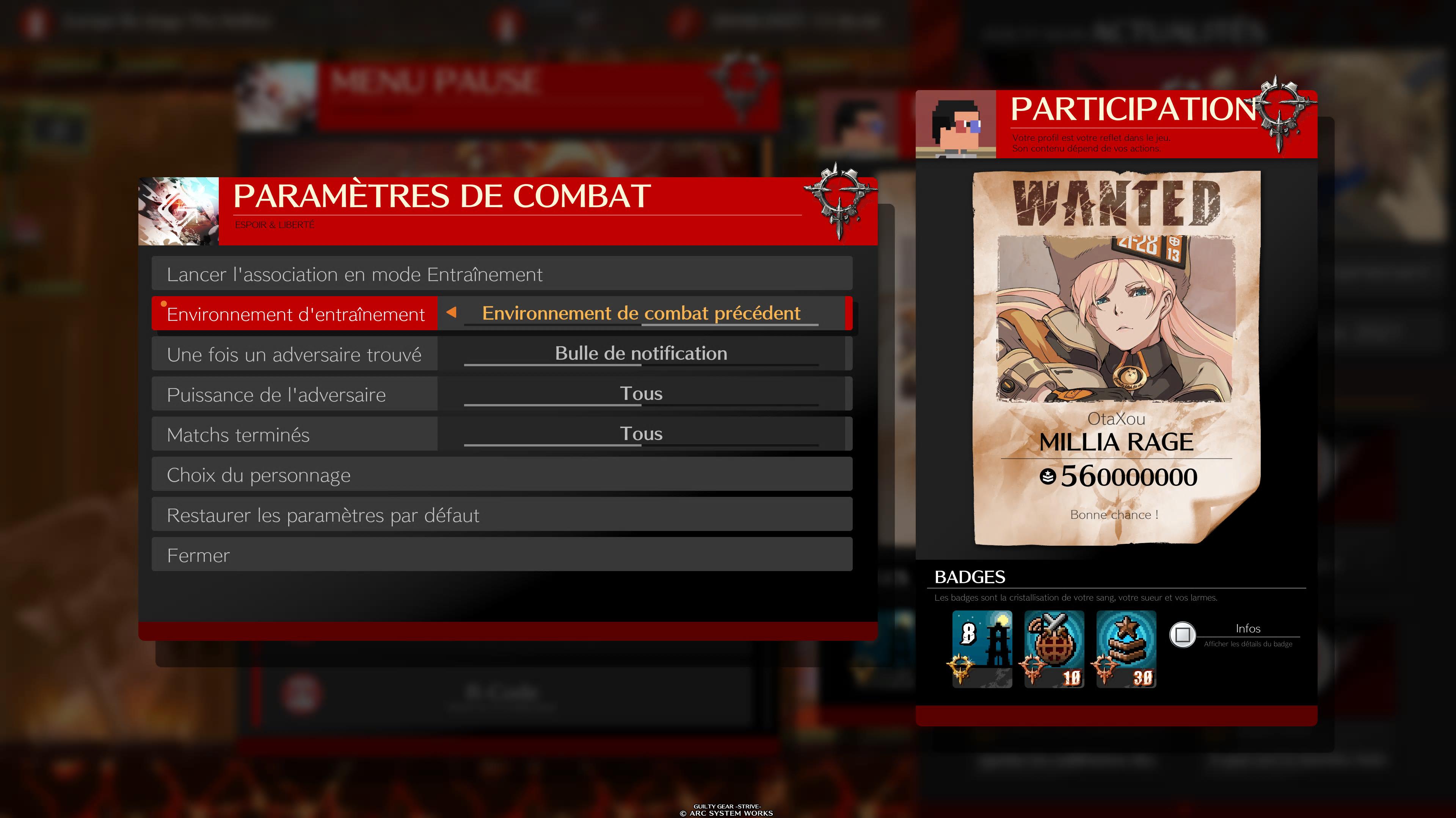 Même lorsque vous faites des matchs en ligne, vous pouvez continuer de vous entraîner. En appuyant sur Start, vous avez en effet la possibilité de continuer votre recherche de match tout en lançant le mode entraînement. Dès lors, en bas à droite de votre interface, un petit message vous préviendra lorsque vous aurez trouvé un match : il vous suffit d’appuyer sur Start pour le lancer. Surtout, cette fonctionnalité vous réserve une option extrêmement bien conçue : lorsque vous êtes dans le lobby, vous pouvez lancer ce mode entraînement avec les mêmes conditions que votre match précédent. Ainsi, si un Potemkin vous a posé problème juste avant, vous pouvez directement lancer le mode entraînement face à un Potemkin et recréer les conditions qui ont réussi à vous déstabiliser pour trouver un contre en utilisant votre propre personnage.