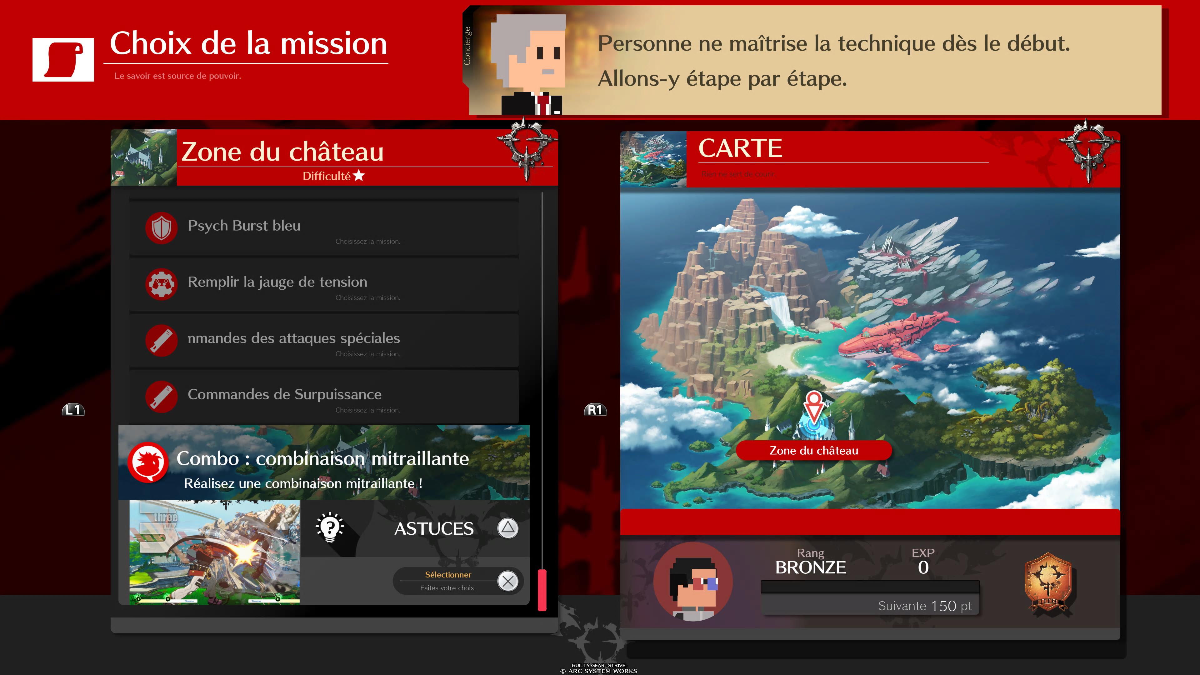 Évidemment, la première chose que vous devriez faire si vous venez d’arriver sur un Guilty Gear, c’est de passer par le mode mission. Le tutoriel est assez basique, mais le mode Mission va beaucoup plus loin. Réparti dans plusieurs cartes qui rappellent un peu les zones de nombreux jeux mobiles, il vous permettra de vous familiariser immédiatement avec différentes notions importantes du jeu, qu’il s’agisse de l’attaque ou de la défense. Et Guilty Gear Strive étant un jeu particulièrement nerveux, mieux vaudra maîtriser a minima tous les aspects défensifs avant d’essayer d’aller en ligne. Exemple simple, mais efficace : saviez-vous que vous pouvez très facilement sortir du coin simplement en allant vers l’avant sur votre recovery ? C’est ce genre de choses que vous apprendrez, et il est très important de le savoir pour survivre en ligne.