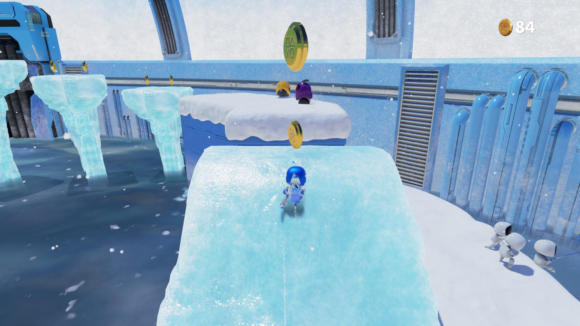 L’haptique surprend aussi. Lorsque les petits pieds de robot d’Astro entrent en contact avec le sol, la manette donne au joueur la sensation correcte : courir sur du caoutchouc ne donne pas la même sensation que sur du métal. Plonger dans l’eau ou sauter sur un ressort donnent une empreinte haptique unique, que les plus attentifs peuvent reconnaître les yeux bandés. Le haut-parleur de la manette contribue à l’immersion en diffusant des bruitages cohérents : un grand « splash ! » au moment de se jeter dans l’eau, un « klang ! » sans appel quand deux plaques en fer se percutent.