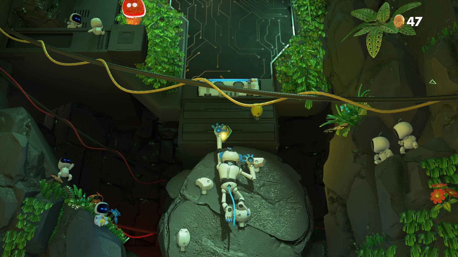Une fois cette séquence d’accueil terminée, on incarne pour de bon le courageux robot Astro au cours de quatre petits mondes de plateforme 3D bourrés de détails, de pièces et d’objets à collecter, et de secrets à découvrir. Cette aventure est courte — moins de 3 heures en ligne droite pour en voir la fin — mais réussit le double pari de « vendre » les capacités de la DualSense tout en achevant de convaincre l’étendue du talent de Nicolas Doucet, le réalisateur du jeu, et de son équipe Asobi.