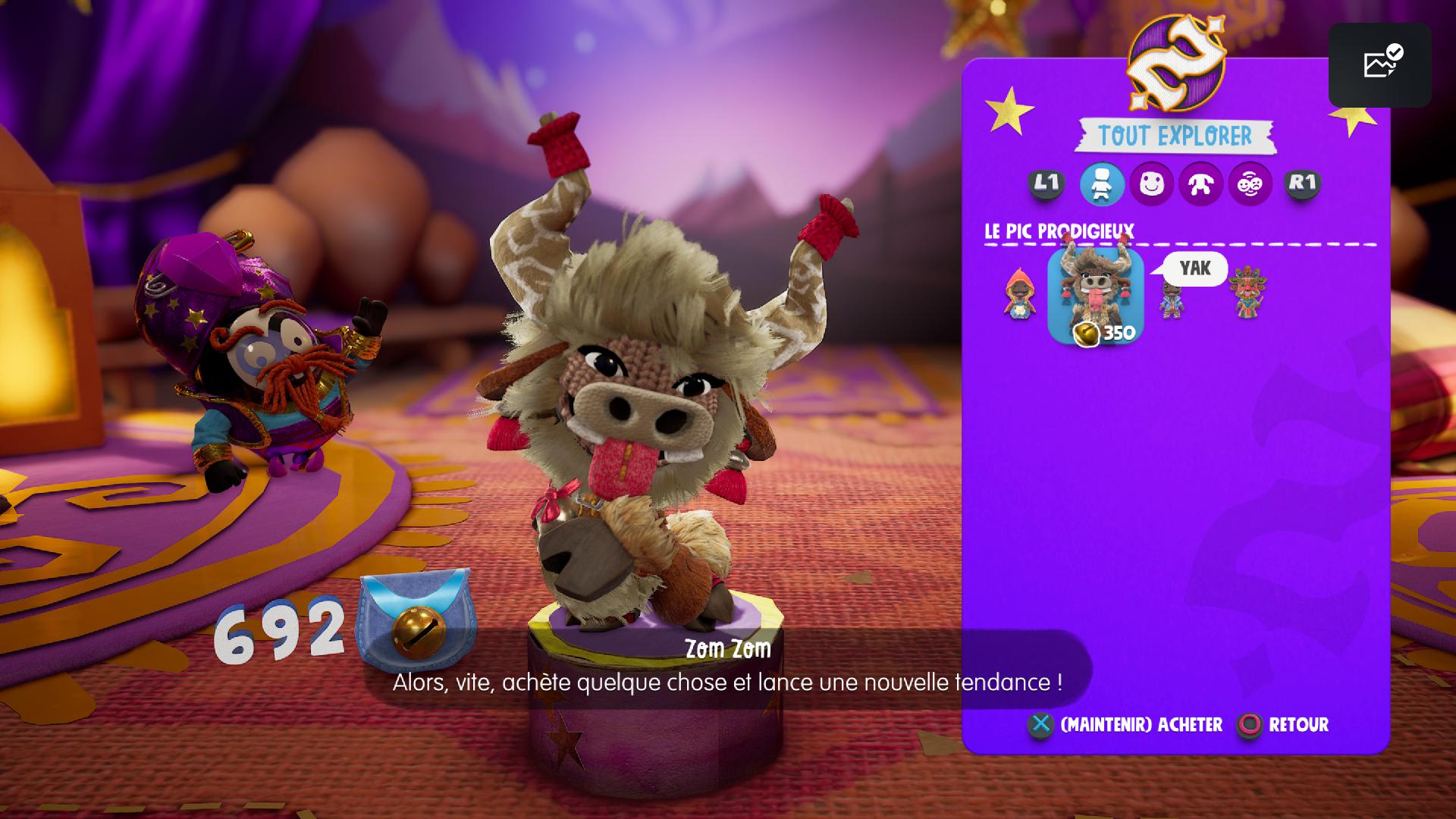 Licence LittleBigPlanet oblige, il est possible de personnaliser son Sackboy grâce aux collectabelles, une monnaie qui se glâne dans les niveaux et sur la carte du monde. C’est dans l’échoppe du truculent Zom Zom que ses collectabelles sont échangeables contre des costumes complets (Viking barbu, vaillant mousquetaire...), ou des éléments de personnalisation plus spécifiques (nouvelle teinture pour Sackboy, yeux de serpents, bouc pointu...). C’est rigolo, et surtout utile pour différencier son personnage d’un autre lorsque l’on joue à plusieurs.