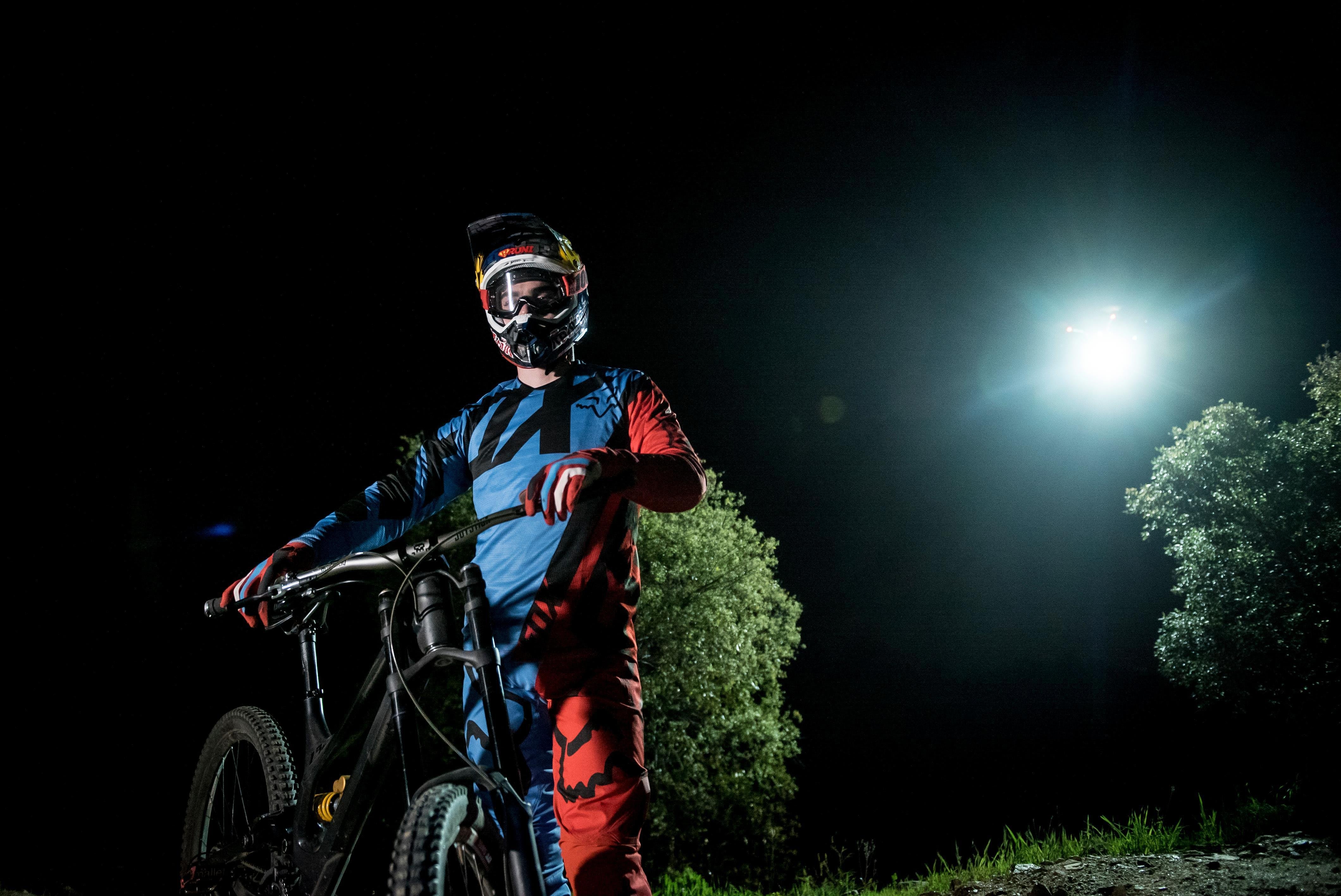 Une prouesse sportive (gaps, passages techniques, wall ride...) autant que technique pour concrétiser une descente à VTT nocturne avec un champ de vision pour le pilote réduit au quasi néant - 15 mètres tout au plus devant le rider. Pour ajouter à la difficulté, il roule sur deux pistes, dont une fraîchement shappée, ou l’ombre des arbres dansant sur la piste vient ajouter au côté déstabilisant du challenge.
