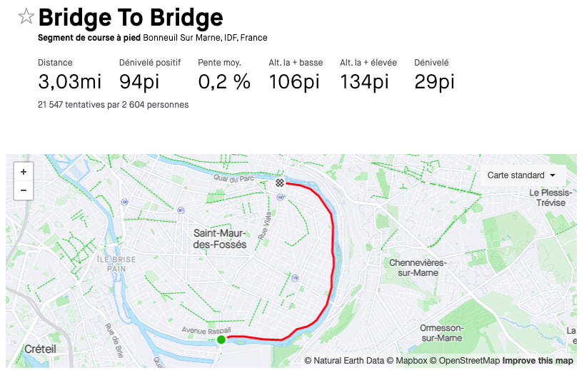 Direction le Sud-Est de la capitale pour un tracé tout en longueur ! Ici, l’idée est de relier le pont de Bonneuil, au Sud, à celui de Champigny, au Nord. Étant tous les deux situés sur la Marne, l’itinéraire vous fait longer le fleuve sur une durée de presque 5 km. Le décor est bucolique, boisé et calme. Bref, c’est un spot parfait pour les coureurs à la recherche d’un tracé moyenne distance dans un cadre apaisant (bon, attention à ne pas vous endormir, un faux-pas et vous finissez dans la Marne).