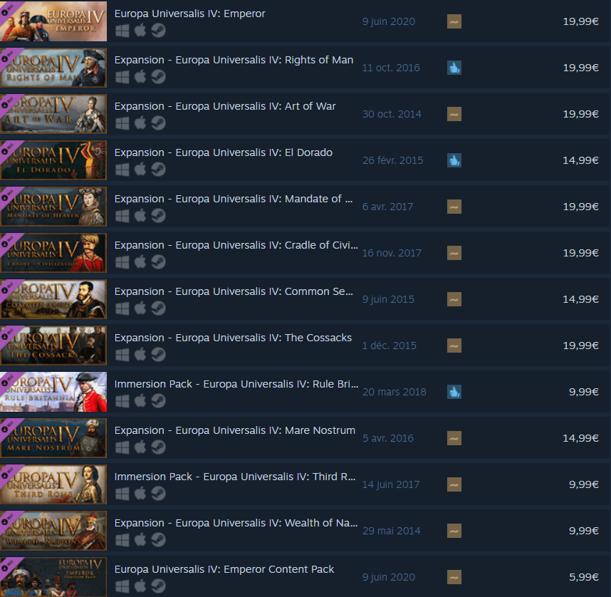 Consulter la page Steam d'un jeu Paradox confère à la fois un sentiment d'extase devant la multiplicité des DLC et d'anxiété parce qu'il va bien falloir trouver un moyen de les payer. Réputé pour sa politique agressive en la matière et ses contenus pouvant coûter, en cumulé, plusieurs centaines d'euros, l'éditeur suédois a régulièrement été attaqué ou moqué sur ce sujet. Le modèle, appliqué à chaque licence depuis la sortie de Crusader Kings 2, vise à « financer davantage le développement du jeu, ce qui se fait au bénéfice de tous les joueurs » selon la maison mère.