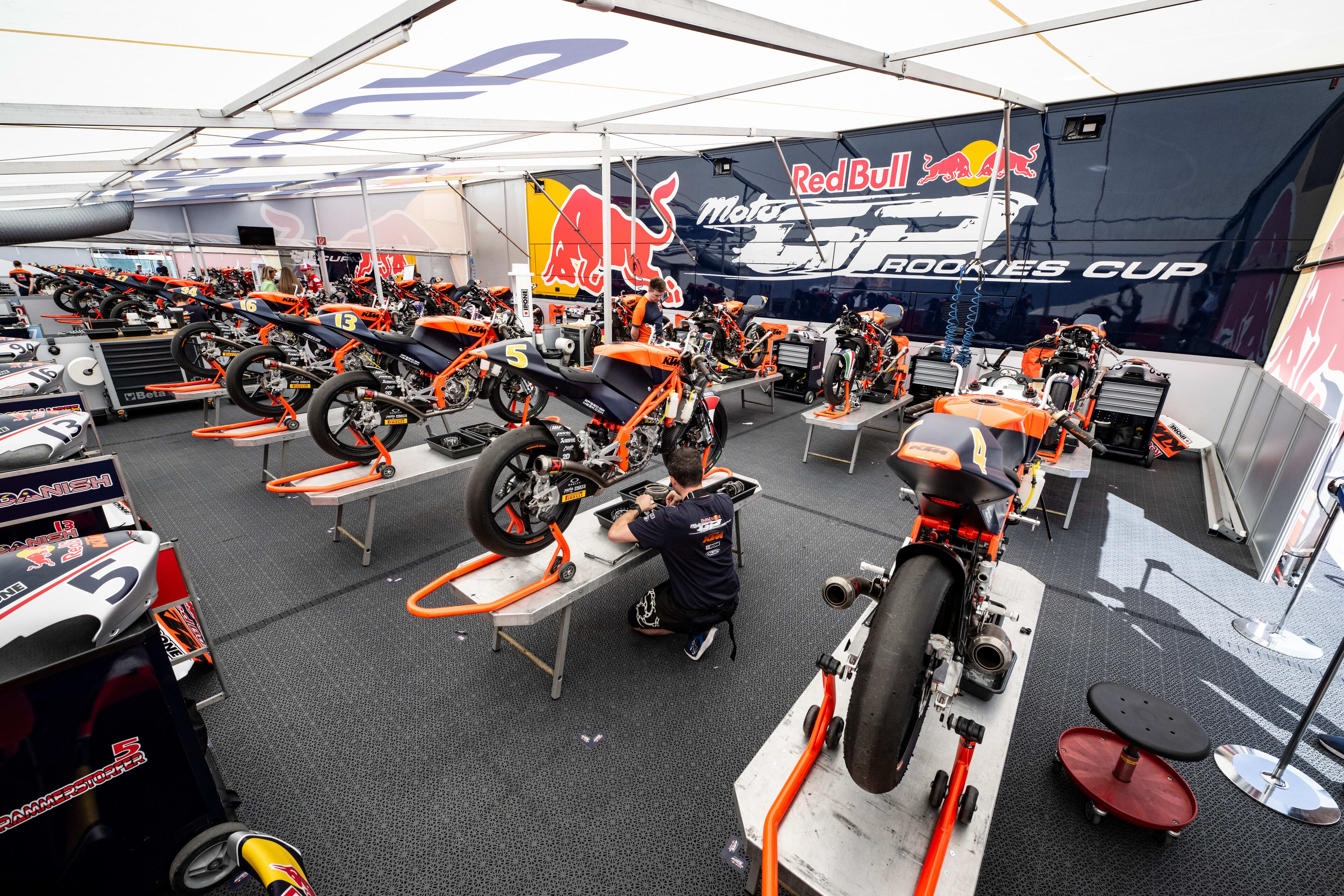 Dans la Red Bull MotoGP™ Rookies Cup, c'est uniquement le niveau de pilotage qui compte. C'est pourquoi tous les participants roulent exactement sur la même moto. Depuis 2013, c'est une machine à quatre temps de Moto3™ qui est utilisée : la KTM RC 250 R. Elle délivre 249,5 cm3 pour un poids d'environ 82 kg et monte en régime jusqu'à 13 000 tr/min.