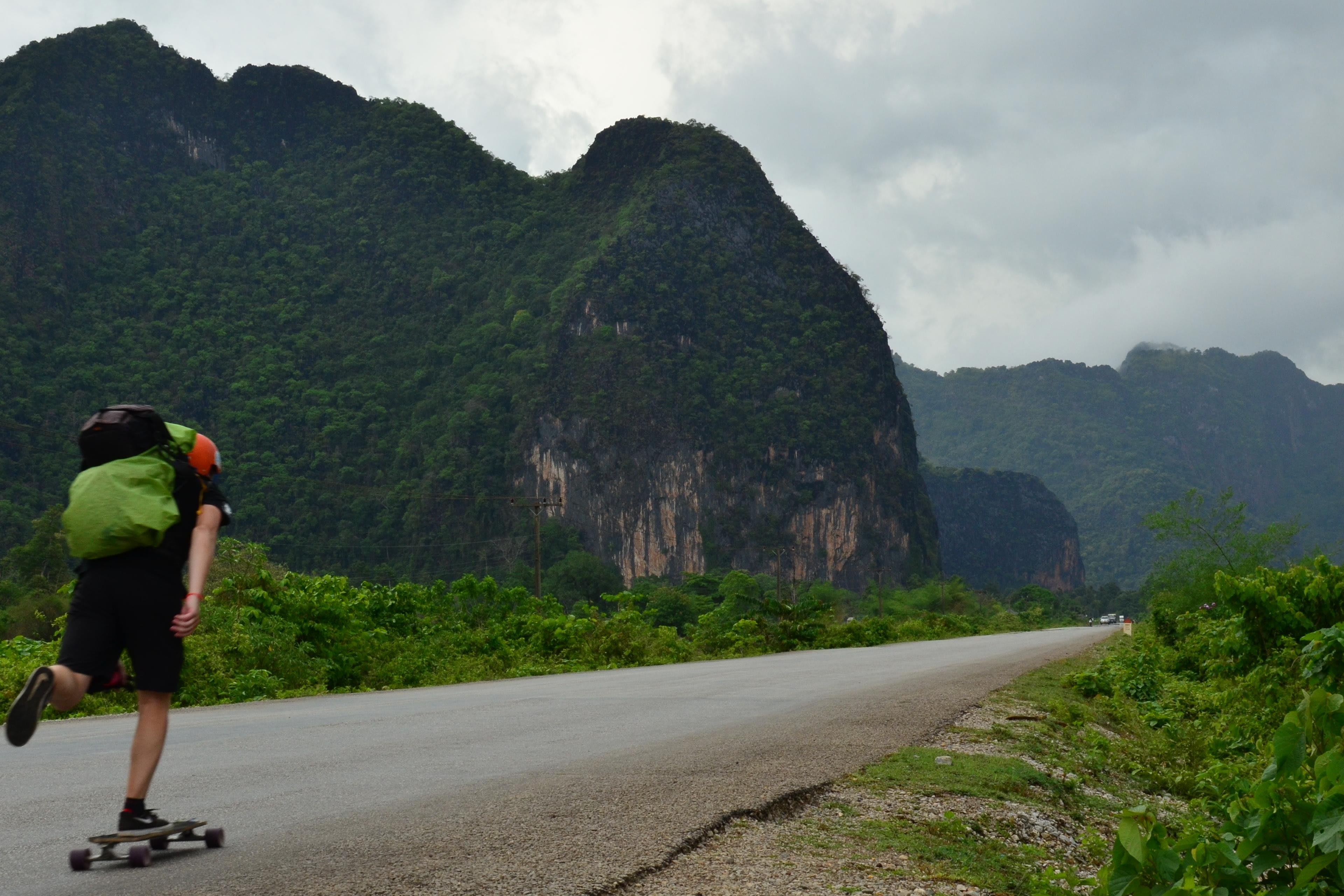 Sur la route très sineuse qui passe par le Cha Lo Border Gate, on ne croise que des montagnes et des petits villages sur des centaines de kilomètres. C’est très beau. Surtout les lumières rasantes en fin de journée et l’accueil des gens dans les villages, qui te saluent quand tu passes en skate. Ma copine, qui me suivait à vélo, était même jalouse. Mais je suis rentré dans un scooter au Laos et suis tombé dans la boue au Vietnam. Donc bon…