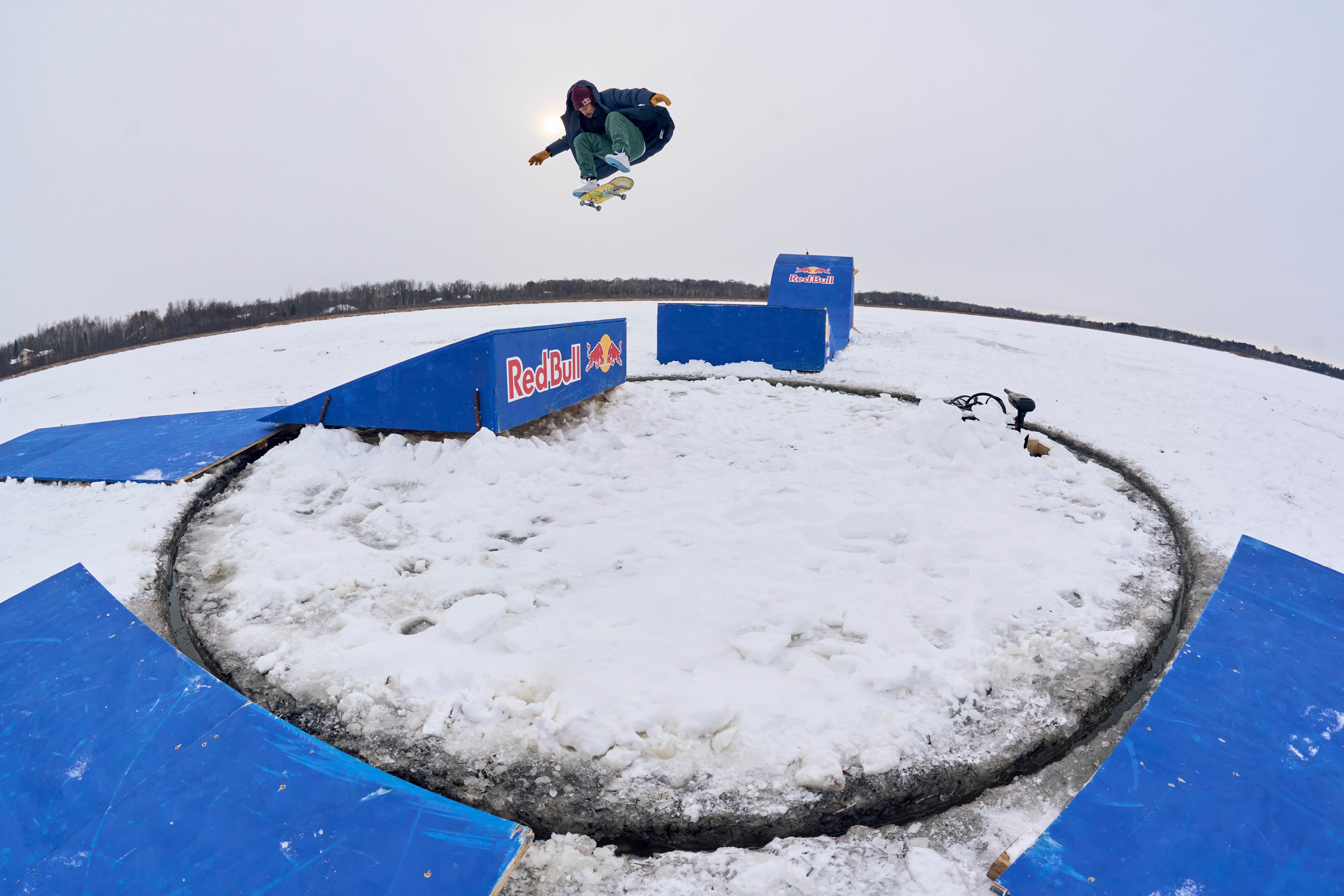 Les skaters professionnels Ryan Decenzo, TJ Rogers et Torey Pudwill relèvent un défi de taille : skater sur un lac gelé dans le Minnesota avec des chalumeaux, des figures et des rampes en mouvement.