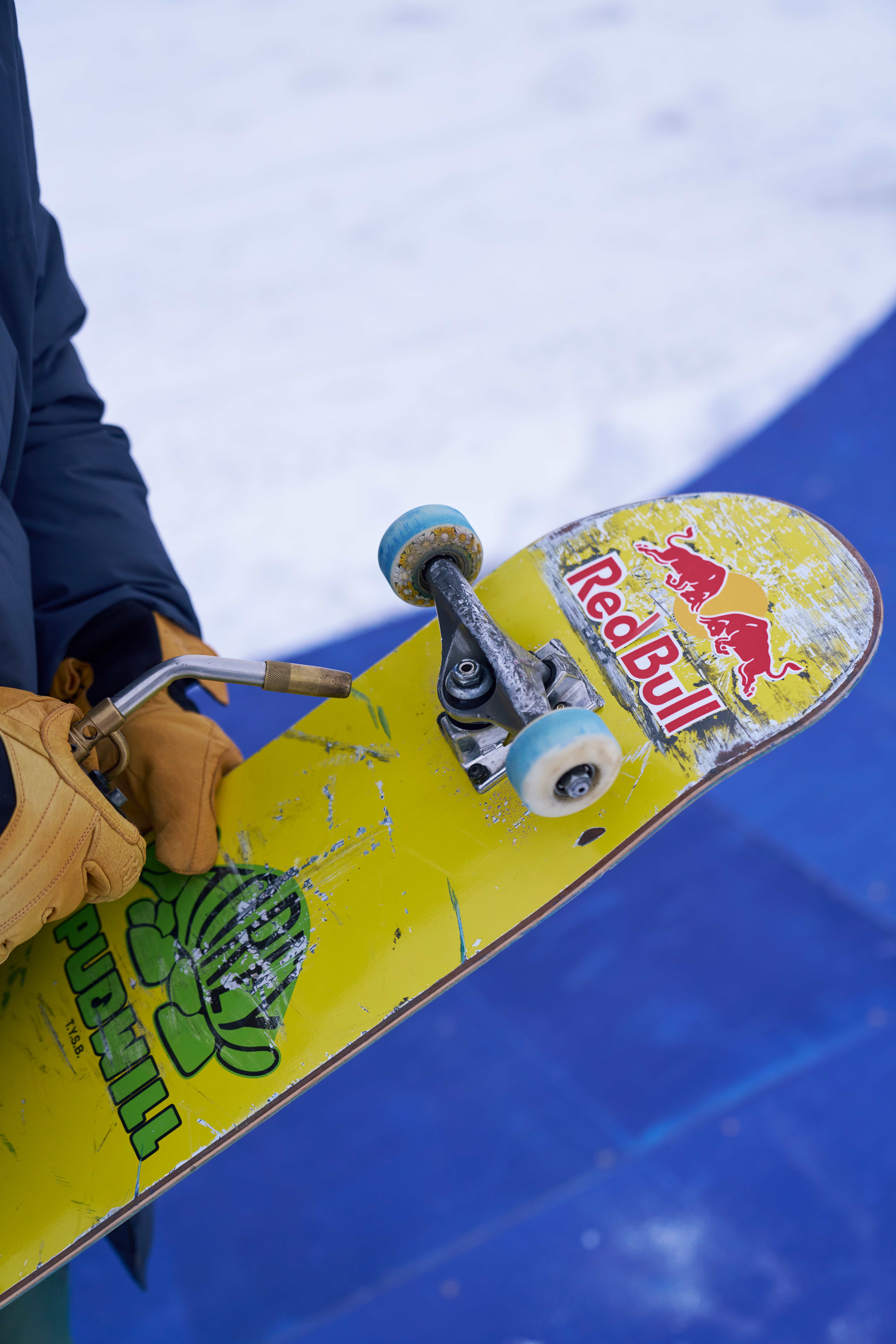 « Quand le chalumeau est sorti, c’était vraiment une idée géniale » raconte Pudwill. « Le premier jour, ma planche a été complètement immergée, mes roulements ont gelé, mes gommes ont gelé, mon grip était gelé – je pensais que c’était fini pour moi. On a utilisé le chalumeau, en commençant par les roulements, et les roues ont commencé à tourner normalement – on voyait l’eau s’écouler. Mes trucks sont passés de totalement figés, durs comme de la pierre, à se desserrer et à bouger à nouveau. Mon grip était tellement gelé qu’il se fissurait. À chaque essai, je devais utiliser le chalumeau sur mes gommes, sinon ça ne tournait pas correctement ».