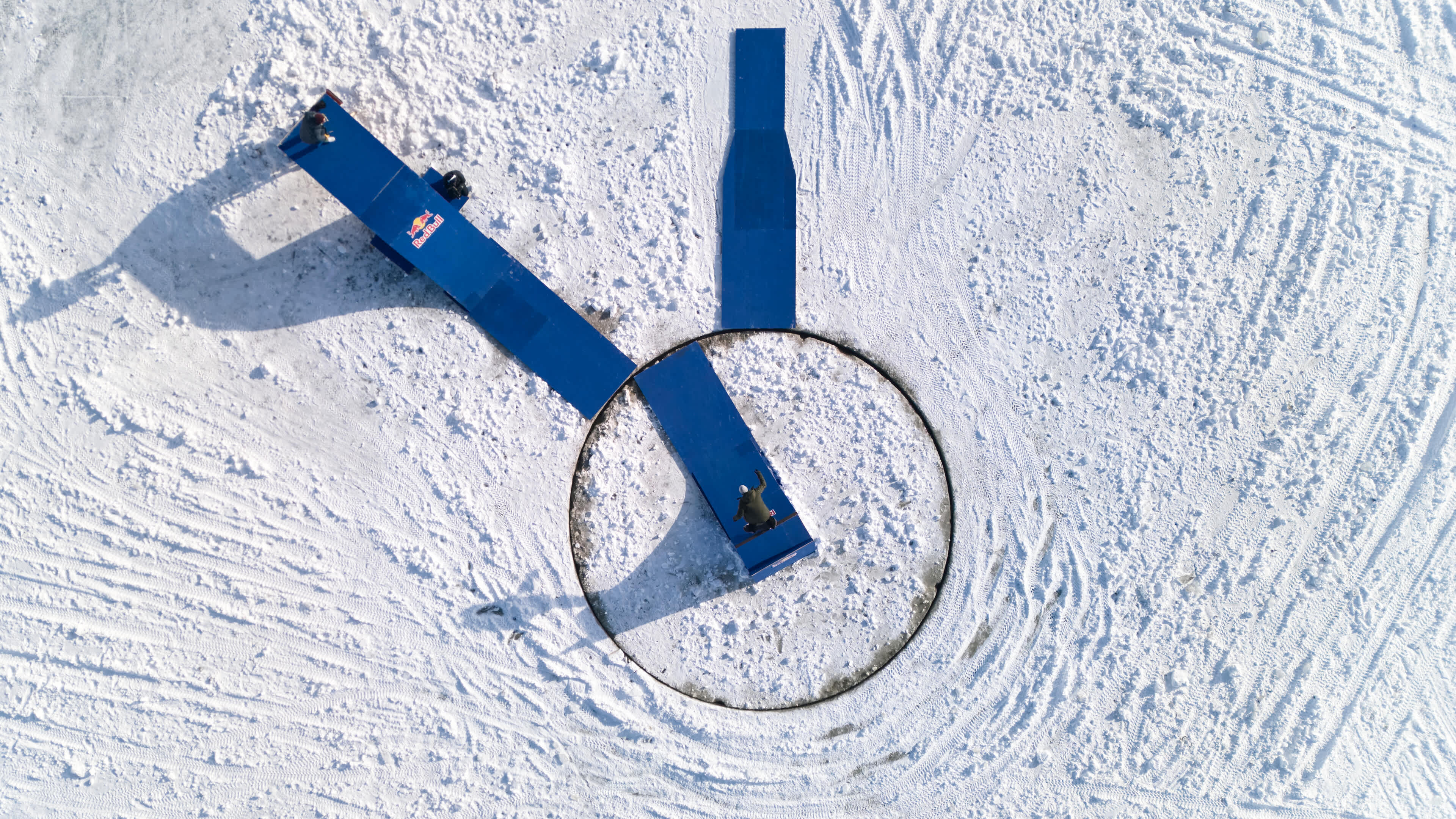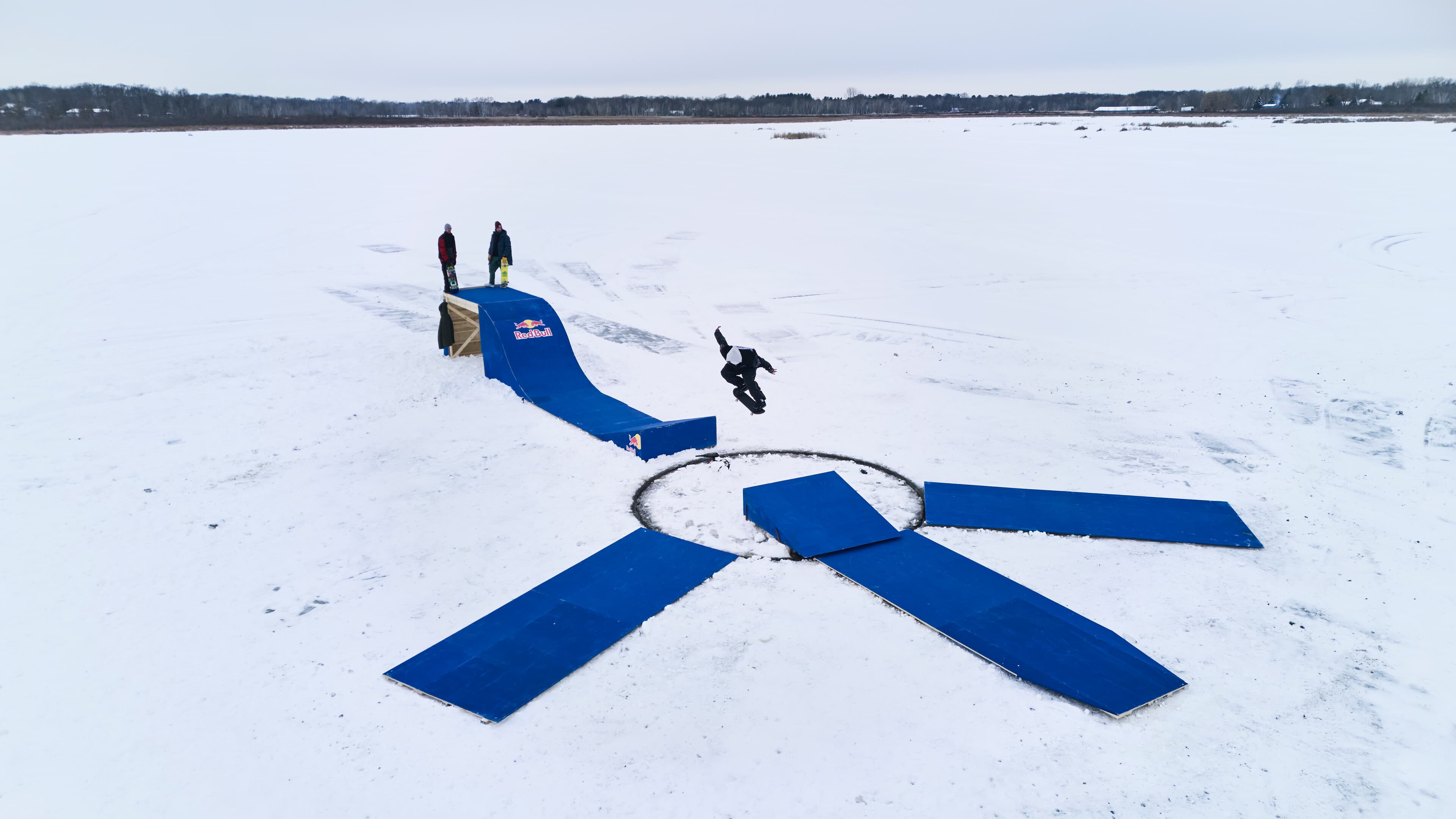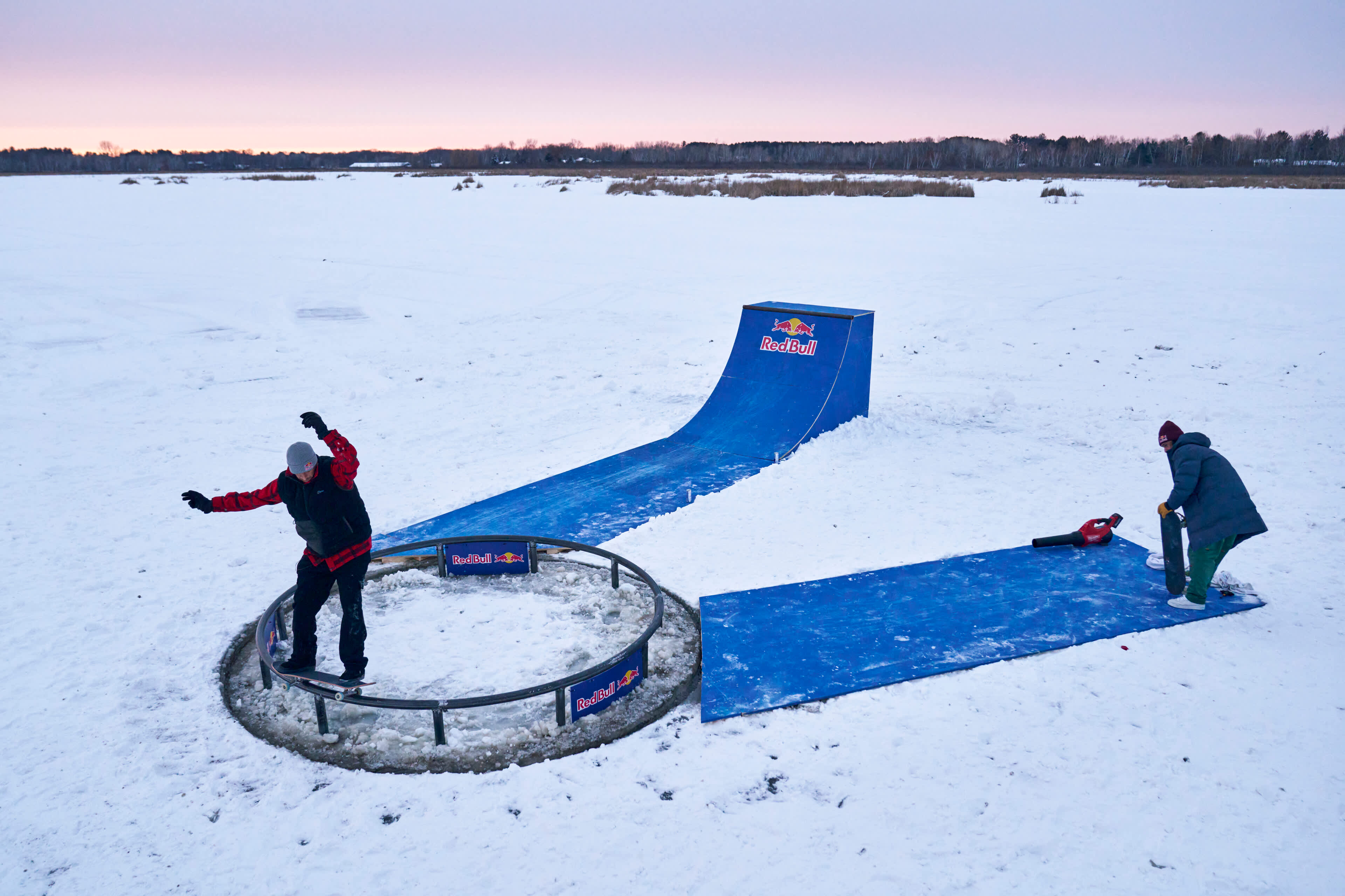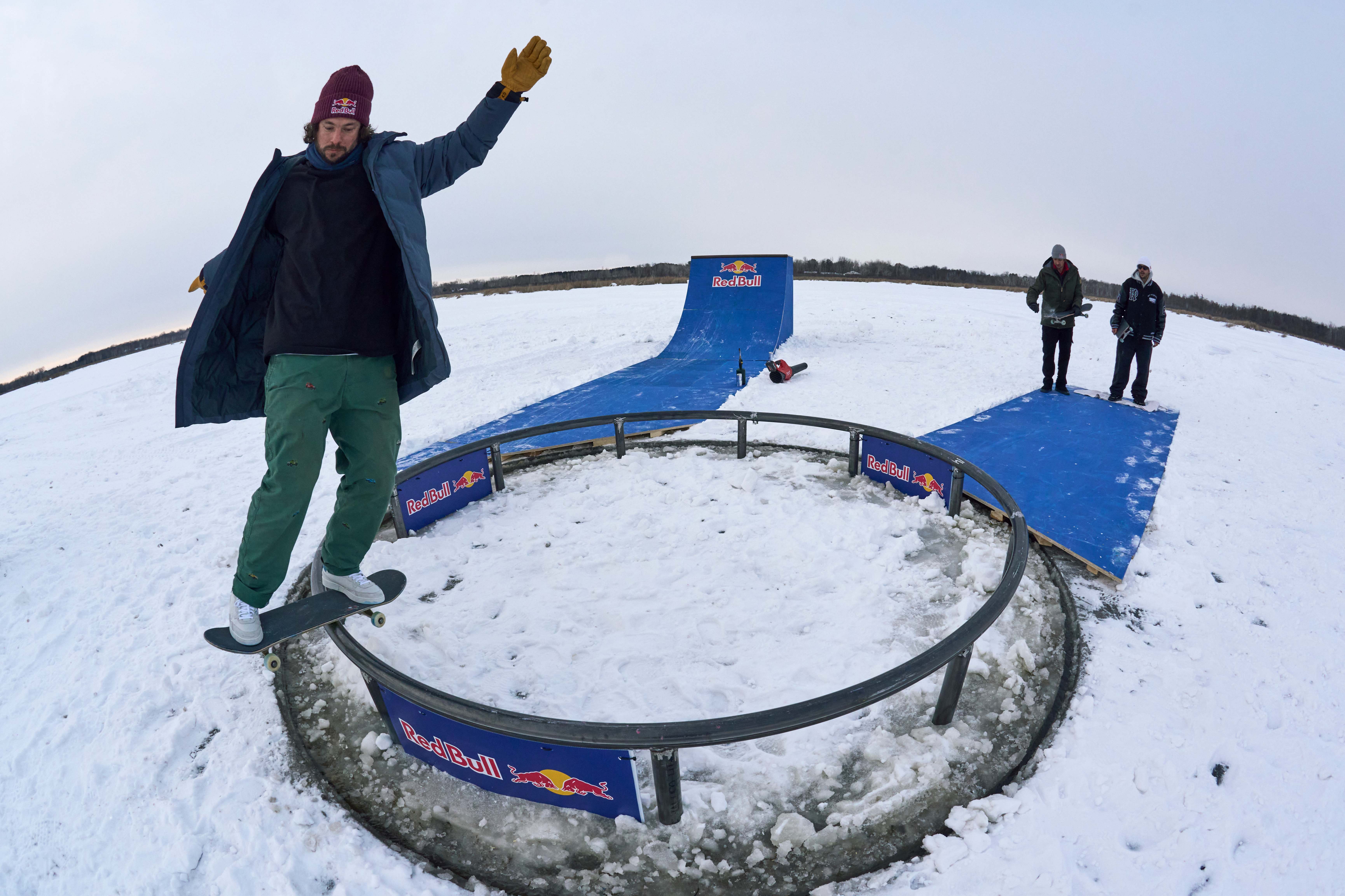 Au lieu de creuser une patinoire, ils ont construit un skatepark rotatif qui a mis à l'épreuve leur équilibre et leur synchronisation pendant trois jours intenses. Le premier jour de travail a été consacré au saut de poteau tournant avec un carrousel de 1,5 m et un vide de 1,2 m à franchir. Le deuxième jour a été consacré à un quarterpipe tournant sur un carrousel de 4,9 m. Le troisième et dernier, le trio a été confronté à un rail circulaire qui faisait le tour du carrousel de 3,7 m, exigeant une précision et un contrôle parfaits de la planche - ce qui n'était pas facile avec les pieds gelés. Chaque élément a exigé un niveau de skate d’élite et une grande capacité d'adaptation.
