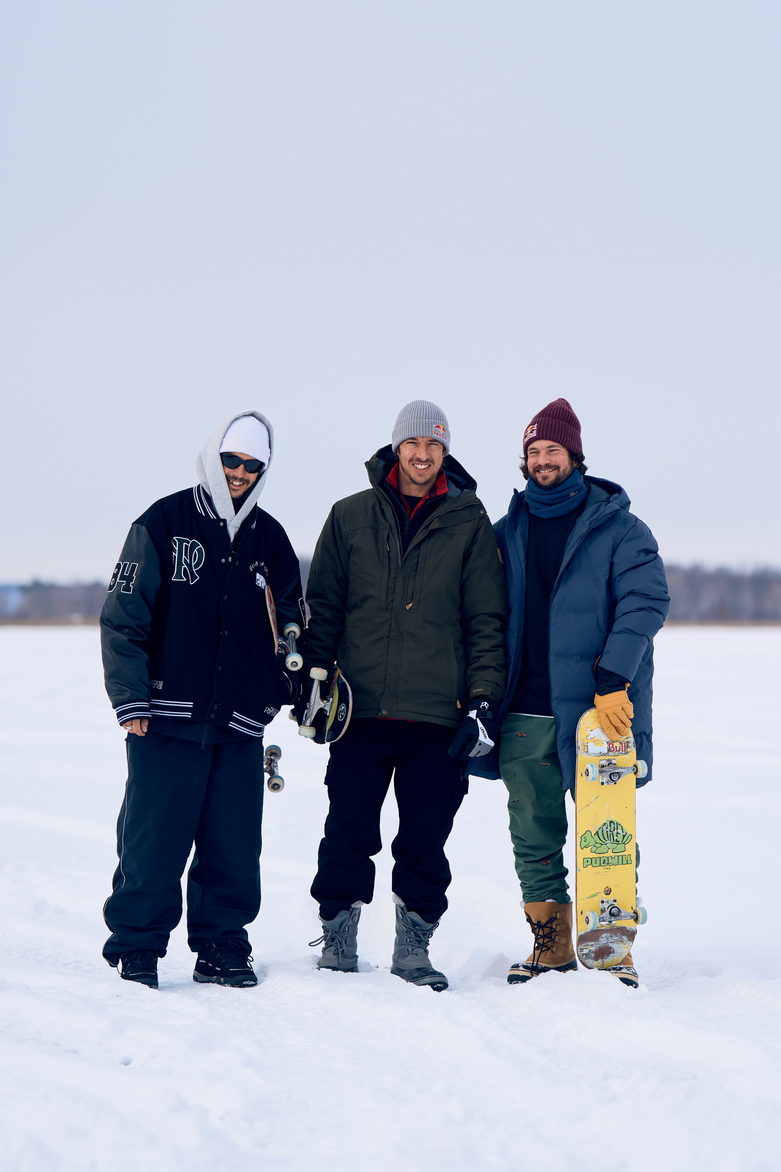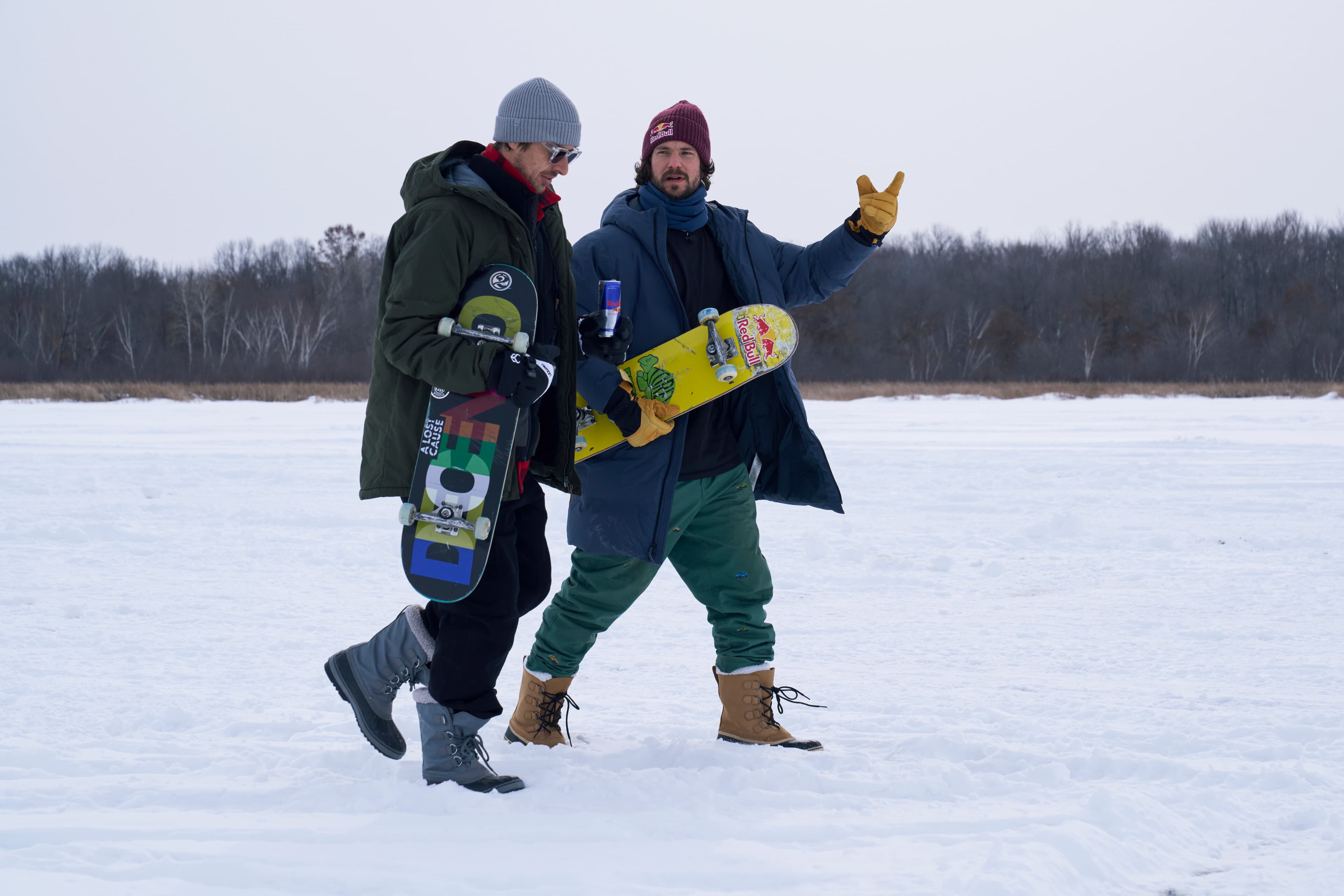 Un skatepark construit au milieu d'un lac gelé dont la température est très, très inférieure à 0°C n'est pas l'endroit idéal pour porter les vêtements habituels dans lesquels Rogers, Pudwill et Decenzo aiment skater. Ce n'était pas un temps à t-shirt. Cela a soulevé un défi majeur lié à la garde-robe : comment skater tout en portant des couches et des couches de vêtements d'hiver épais et encombrants.