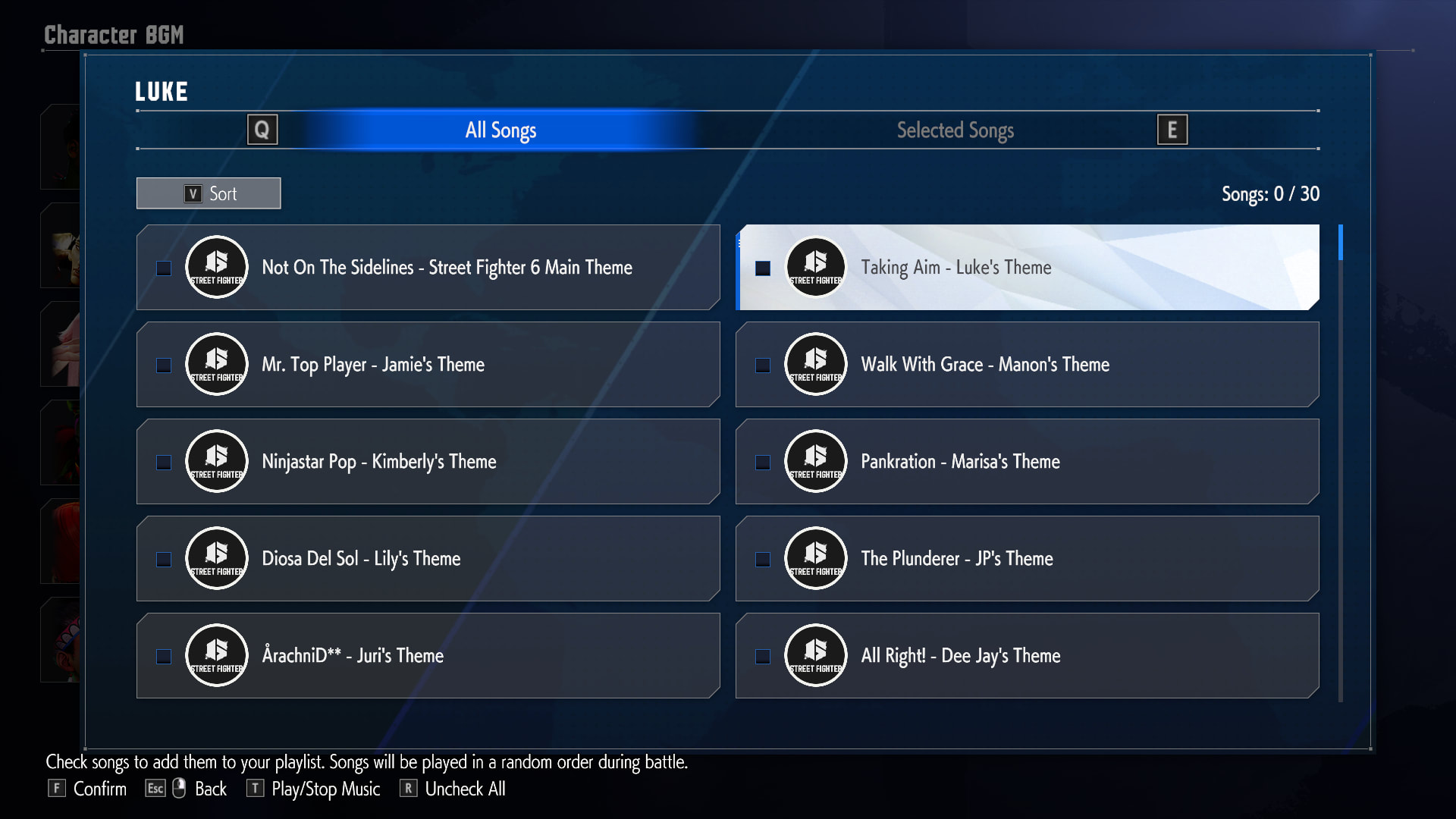 Avec la mise à jour la plus récente, il est possible d'utiliser sa propre playlist de musiques pour l'attribuer à certains (ou à tous) les personnages. Ainsi, si vous préférez le thème de Cammy dans Super Street Fighter II Turbo, vous pouvez désormais l’avoir dans les oreilles sur Street Fighter 6.