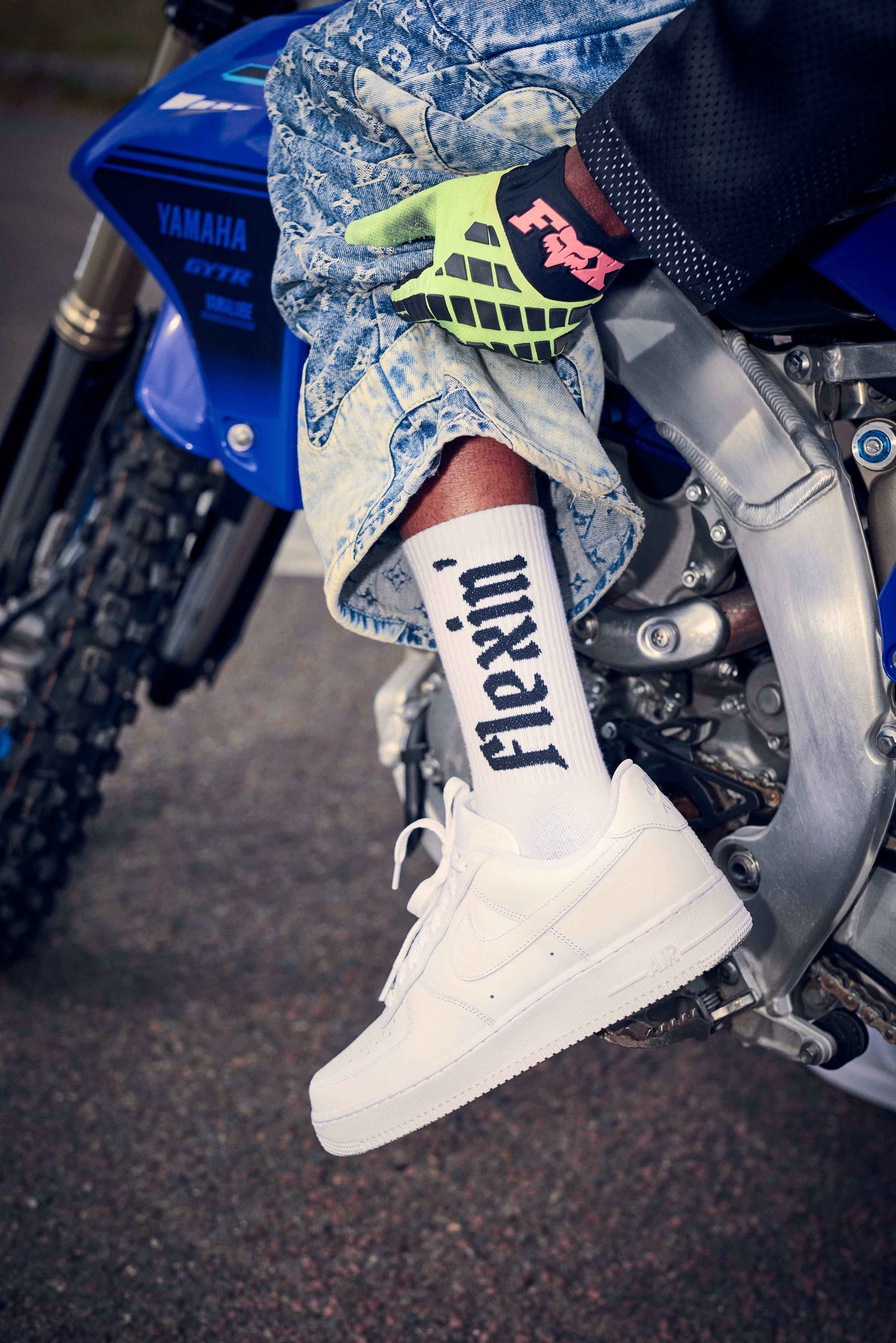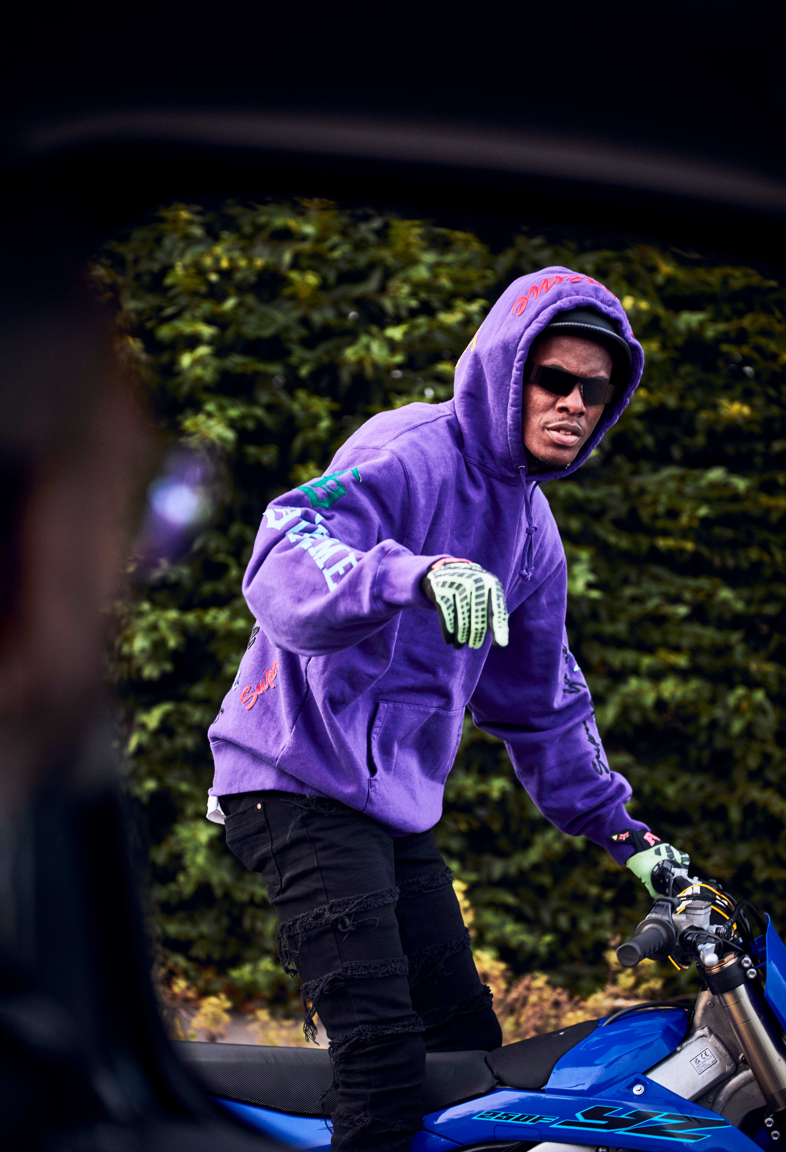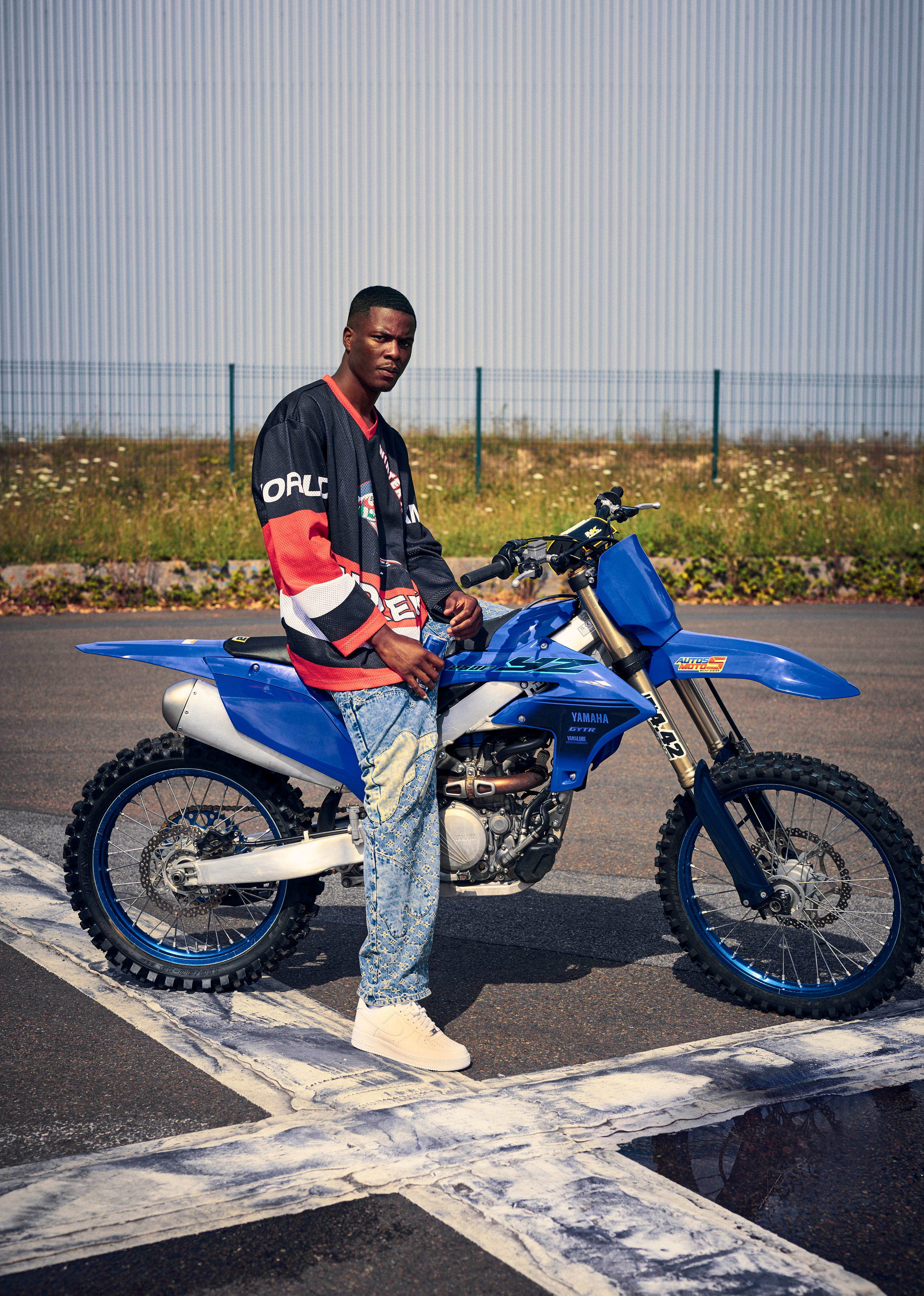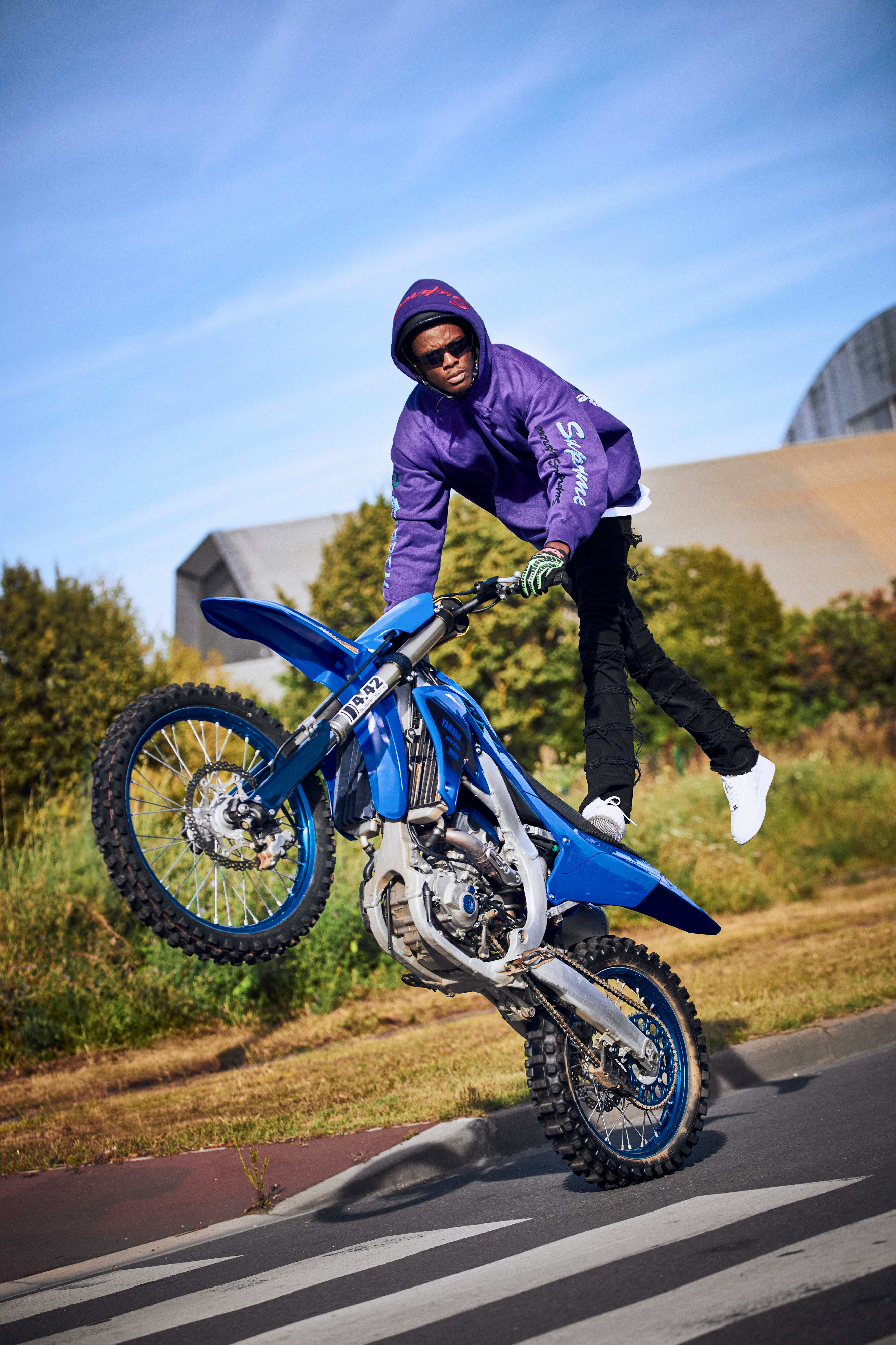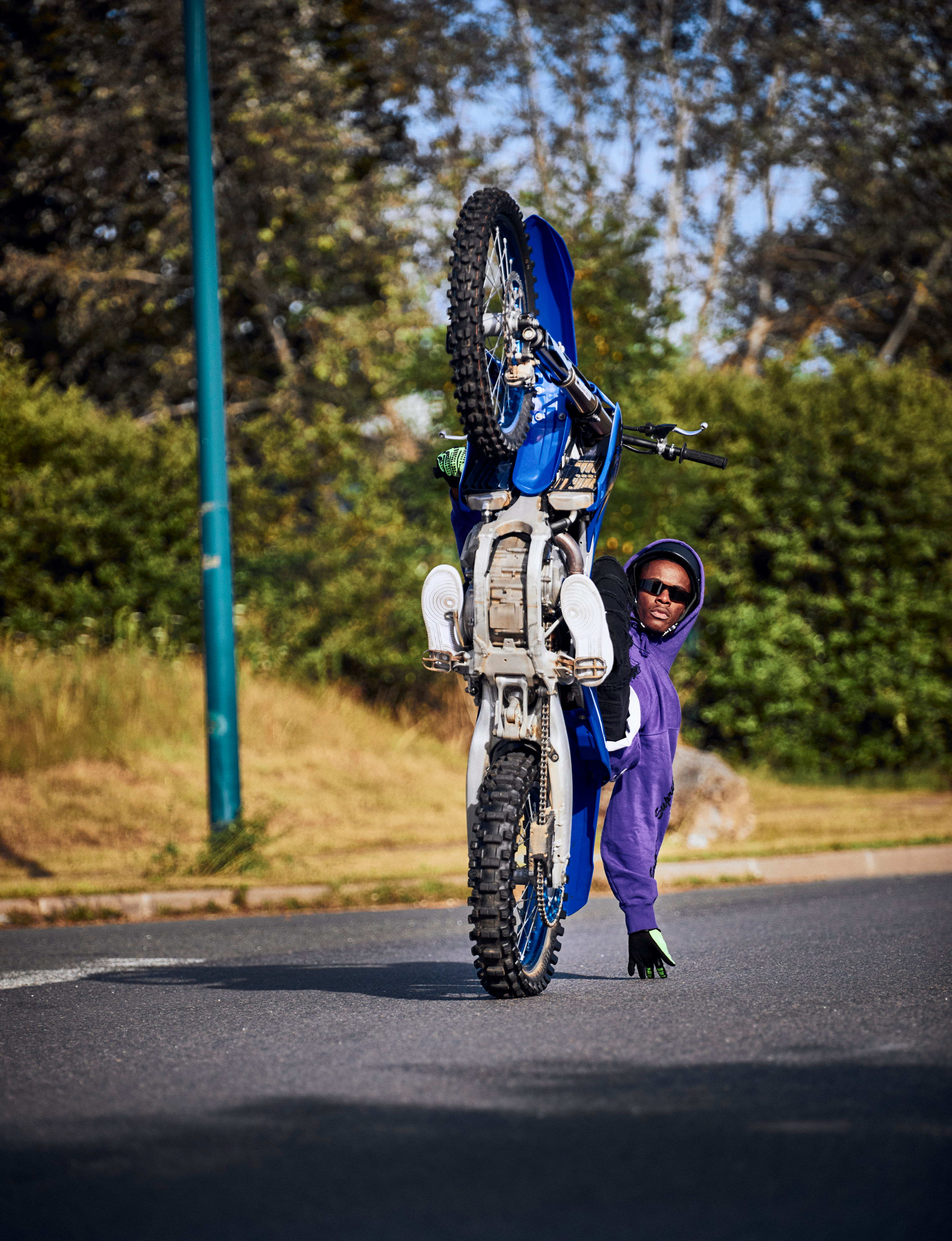 « Le prix des machines te refroidit, surtout quand tu es jeune. Je me suis débrouillé pour m’acheter une mini moto au début, mais j’ai eu la même sensation que quand j’étais arrivé à bout du vélo : une frustration, par manque de puissance. J’ai acheté de plus en plus gros, de plus en plus puissant. Ma première vraie moto était une YZ 125 de 2004 que j’ai achetée pour pièces de base, en plusieurs cartons... Sur l’annonce, elle était en miettes. (rires) J’étais parti récupérer ces pièces en RER avec un pote, le vendeur a eu pitié de nous voir repartir avec tout ça en direction du train ; il nous a raccompagnés chez nous en camion. Pour compléter, j’ai fait l’acquisition de plusieurs pièces quand j’avais un p’tit billet, chez un revendeur qui s’appelait Arnoroule. J’ai mis presque un an à la remonter/réparer entièrement. Je roulais avec à la sortie des cours, tous les week-ends. C’est là que tout a commencé. En 2014-2015, quand j’ai acheté une MT-07 et réalisé des tricks Bike Life sur une moto homologuée, c’est comme ça que je me suis fait connaître. Puis j’ai passé un autre step avec ma chaîne YouTube. »