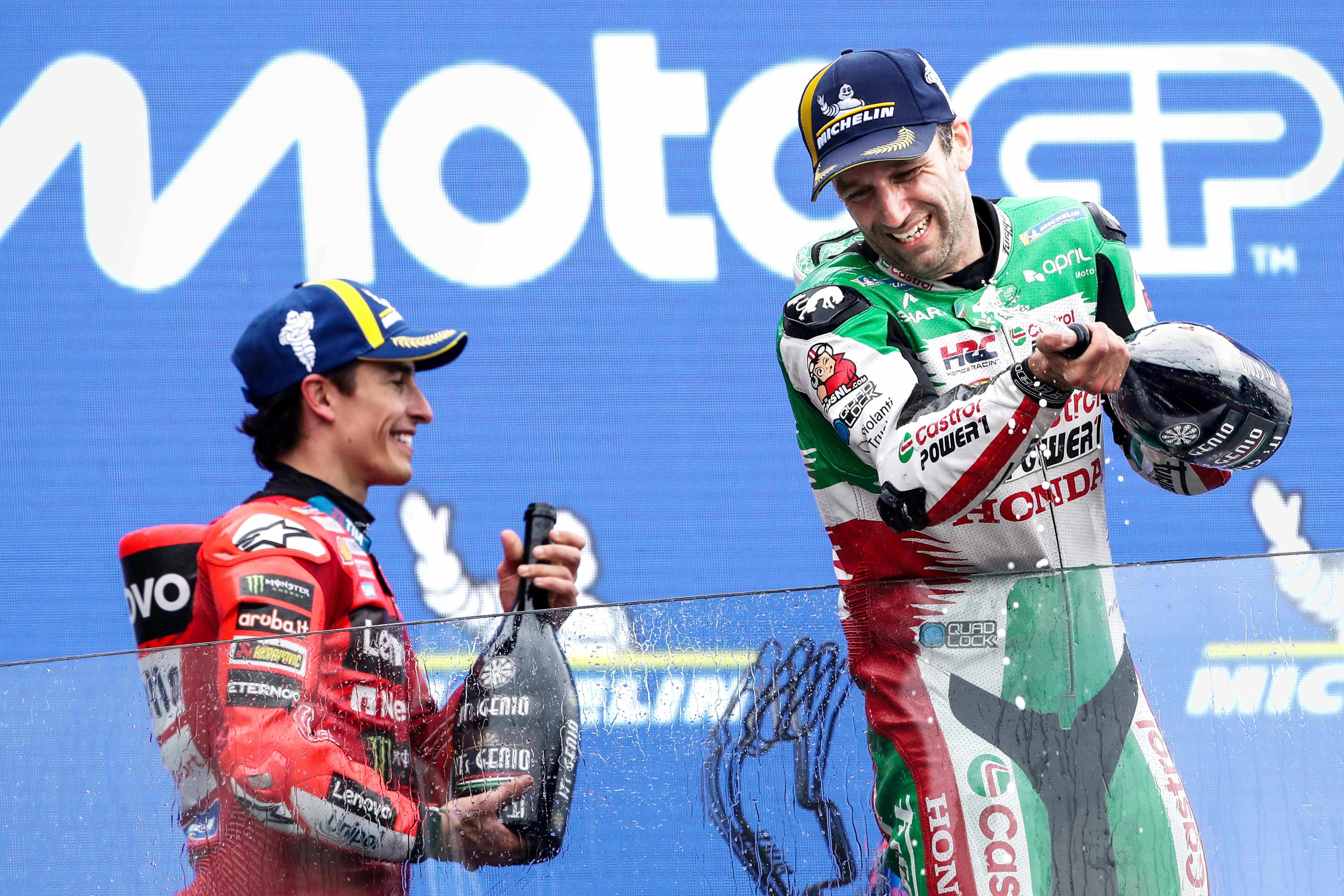 Johann Zarco célèbre sur le podium du Grand Prix de France Moto 2025