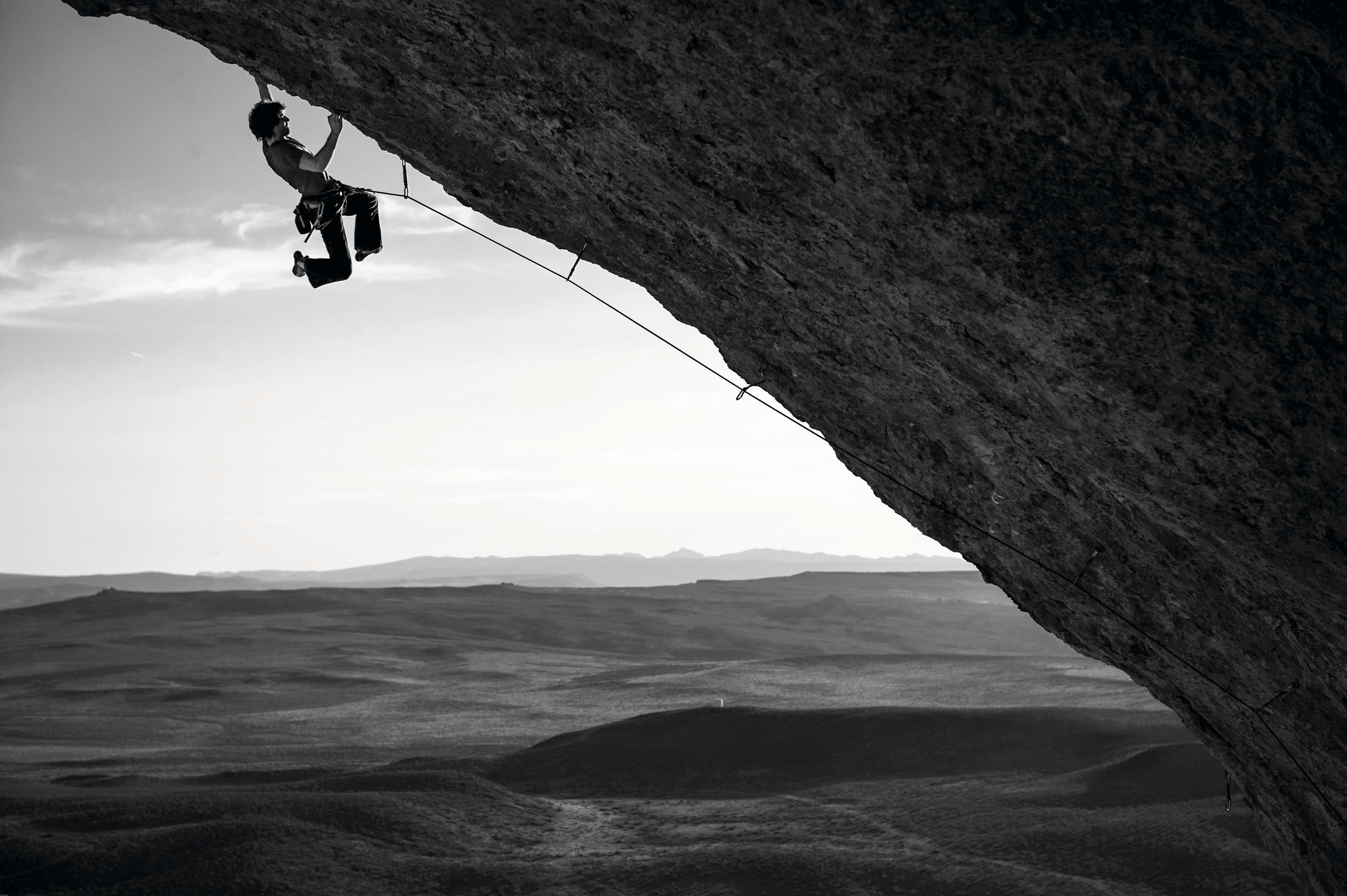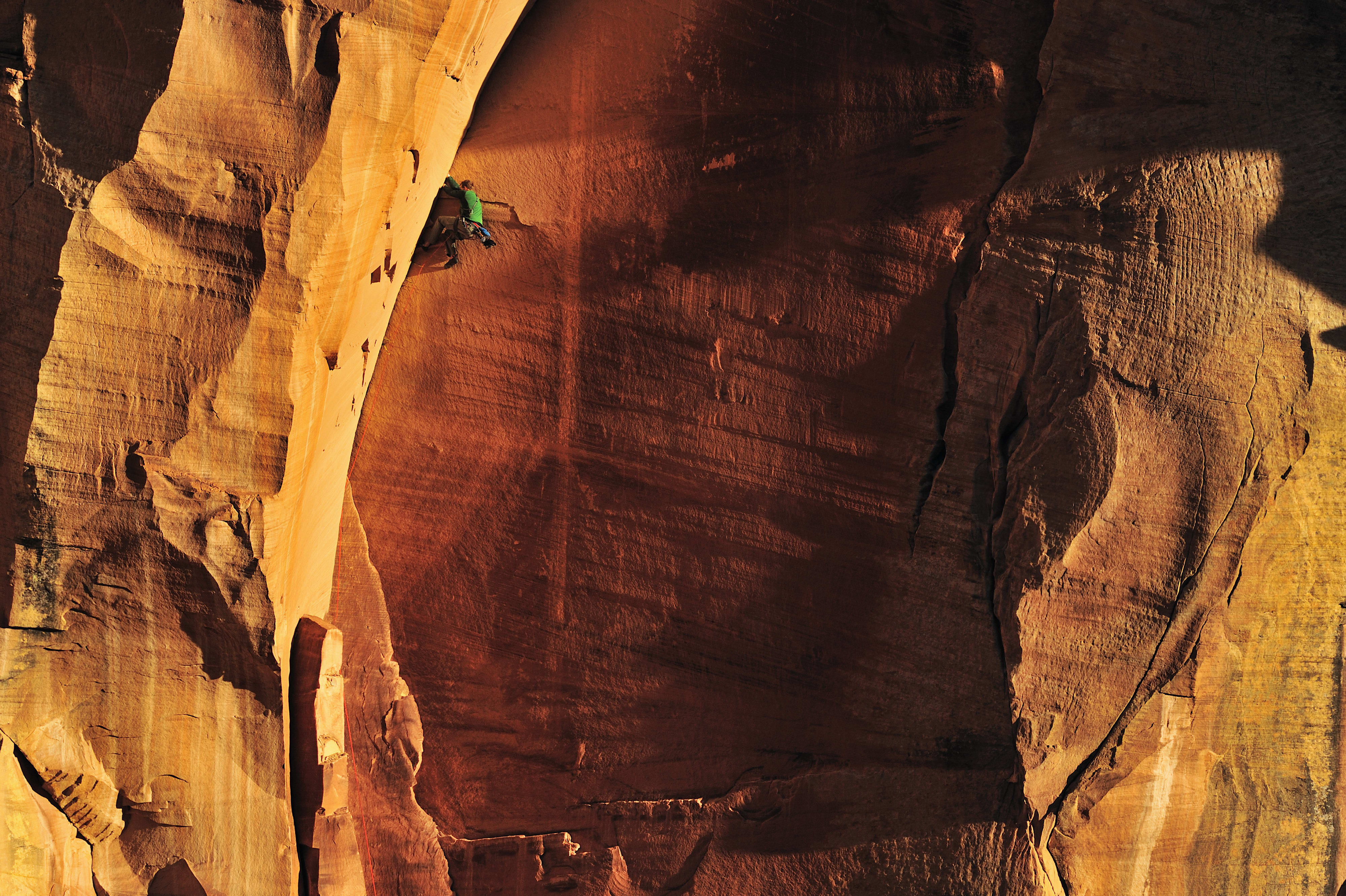 « Le désert du Nevada regorge de voies d’escalade en grès qu’aucun homme n’a encore conquises. Mike tente ici l’ascension d’un rocher aussi raide que lisse. »