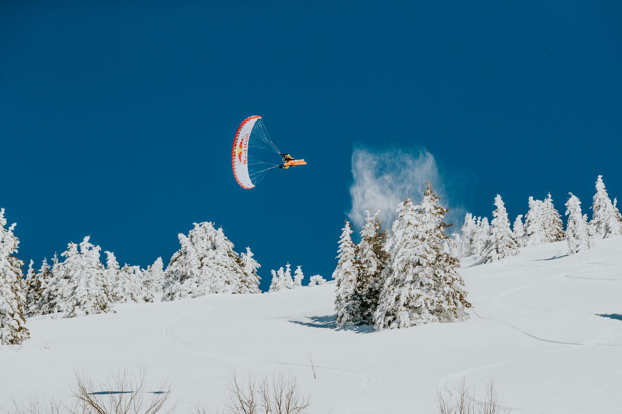 Bon, on commence par une discipline qui s'adresse aux amoureux de l'extrême : le speed-riding. Si le principe ressemble plus ou moins à celui du snowkite (dont on parle juste en dessous), les sensations, elles, sont bien plus intenses. Valentin Delluc nous en parlait récemment et l'a prouvé à de multiples reprises dans des projets comme From Avoriaz With Love ou Moonline. Sur le papier, le principe du speed-riding est simple : skier tout en étant équipé d'une voile de parapente pour s'envoler. Et il n'est pas rare que les riders atteignent des vitesses frôlant les 70km/h et s'envolent à plusieurs mètres au-dessus du sol. Vous l'aurez compris, mieux vaut avoir le coeur bien accroché, donc.