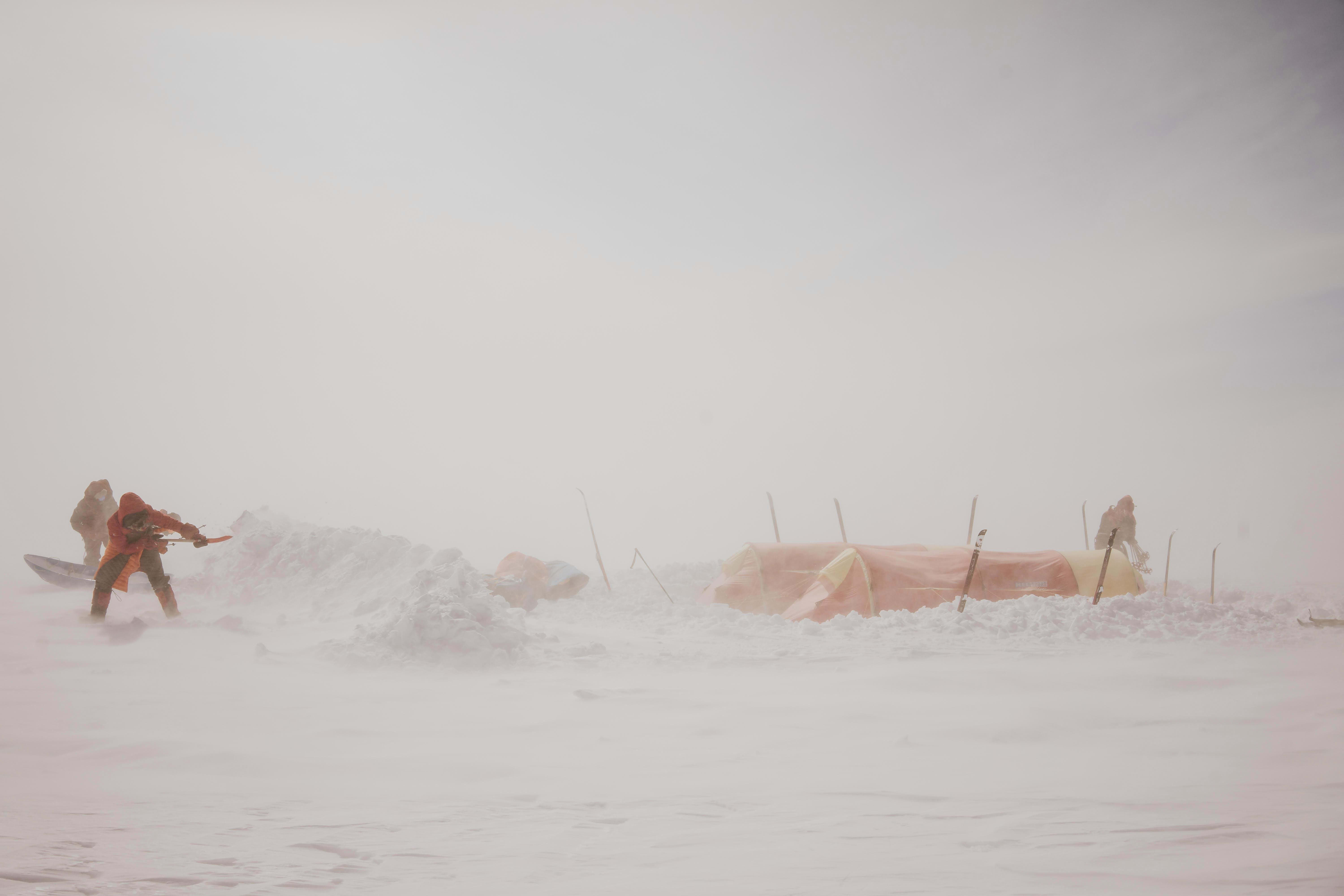 "If a storm is coming, dig down into the snow to create a platform that lowers the height of the tent, then build a 50cm snow wall towards the wind about 8m away from the tent to protect it from being blow away or buried."