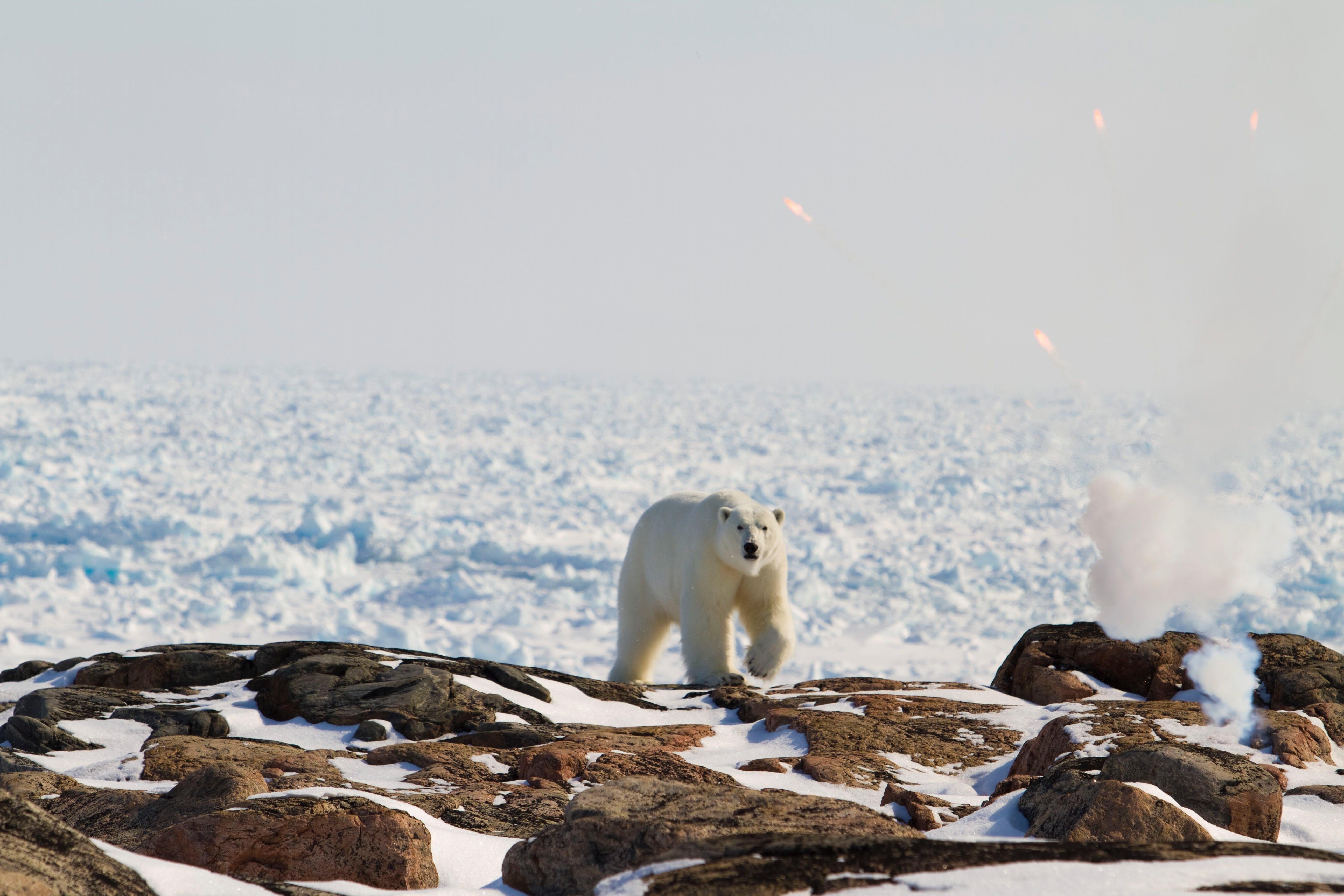"What to do if you find yourself face to face with a polar bear? Never shoot a bear unless it's absolutely necessary. Remember — you are in their home. Re-group everyone and if possible try to move away. Attempt to scare the bear away with flares, bear bangers or shoot your gun into the air. My number one technique is to simply to shout at the bear. Seriously - tough talk that bear; shout, swear, tell him if he doesn't move away you are going to...well, I'll let you fill in the blank."